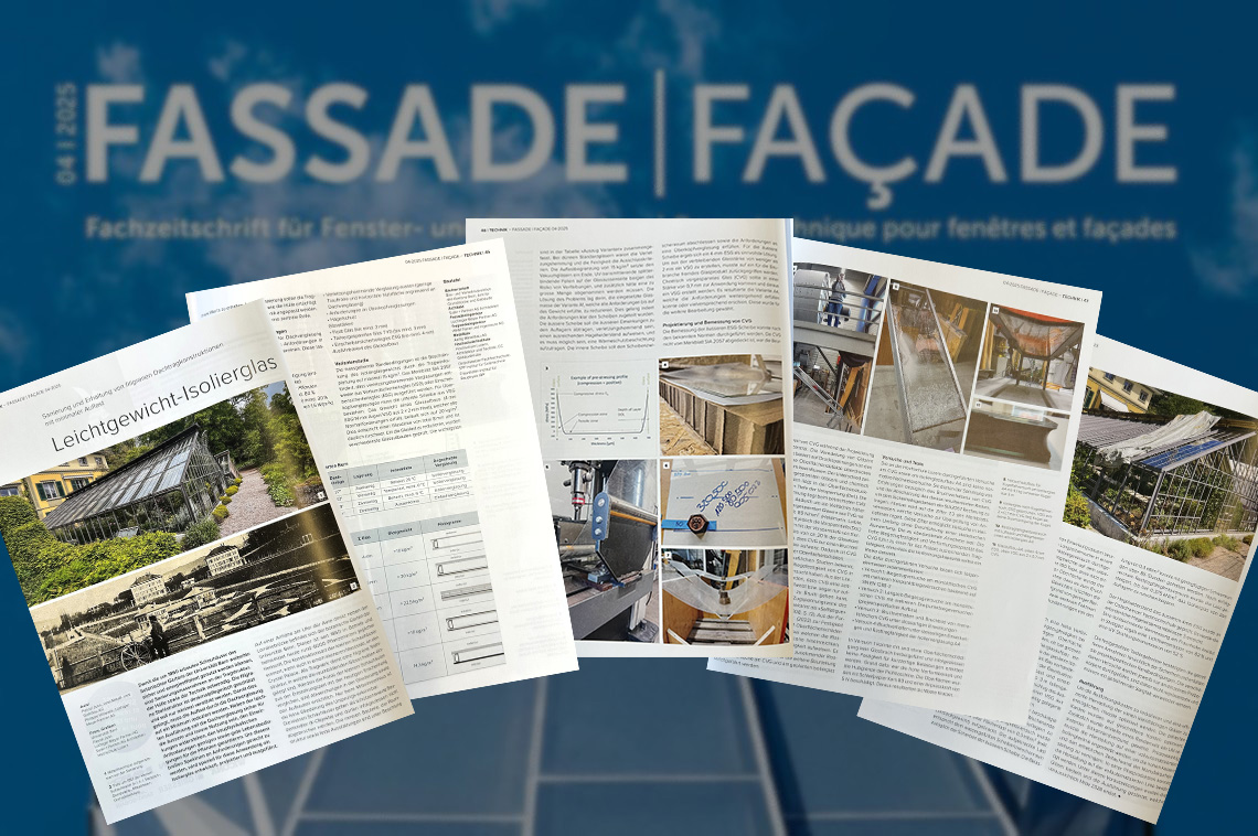 Renovation of the small greenhouses of the Botanical Garden of Bern – awarded the Building Award 2025, presented at the YES-Symposium 2024 and the Glass Performance Days 2025 … and now comprehensively documented: The current issue of FASSADE | FAÇADE 04.2025 by SZFF contains a detailed technical report on the research and construction project. The article by Pascal Joos and Philippe Willareth is titled “Lightweight insulating glass – Renovation and preservation of filigree roof structures with minimal load-bearing capacity”. On several pages, the authors present the complex requirements and boundary conditions, discuss the variant study, the glass design the tests carried out and look ahead to the construction phase. The practical report is illustrated with very impressive images of the test series.