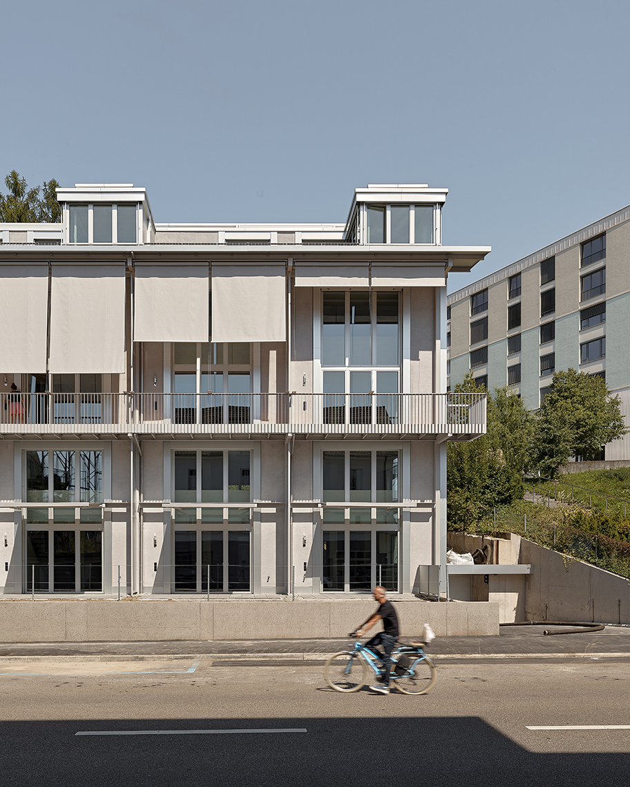 The approximately rectangular five-storey apartment building replaces the existing commercial building. The construction project comprises a basement with cellar compartments and underground car park, as well as a ground floor, three upper floors and an attic floor. A pergola was built on the north side to provide access to the apartments. This can be reached either by a lift integrated into the building or by a steel staircase separate from the structure.