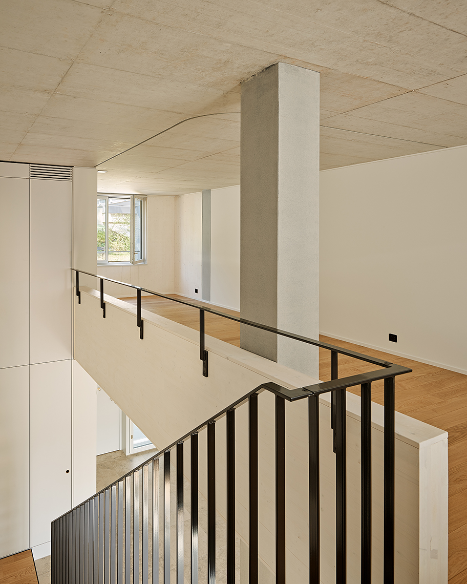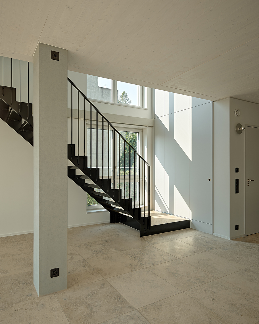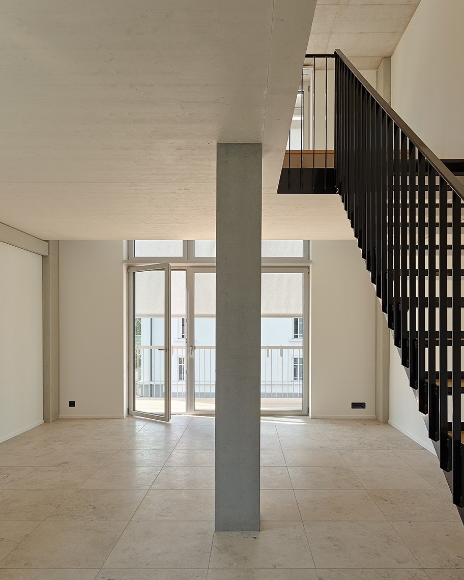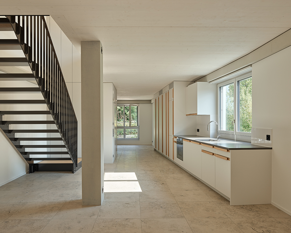 The core objective of the project is to ensure the greatest possible flexibility, which is why the apartment partition walls are made of masonry and the intermediate ceilings of the maisonette apartments are made of wood so that they can be dismantled. The remaining ceilings are made of in-situ concrete. Two-storey continuous columns in the centre of the apartments transfer the loads from the upper floors to the basement. In addition, a single-storey wooden column on the ground floor allows for a large recess in the CLT ceiling for the staircase to the upper living area.