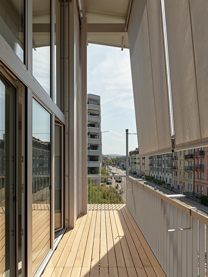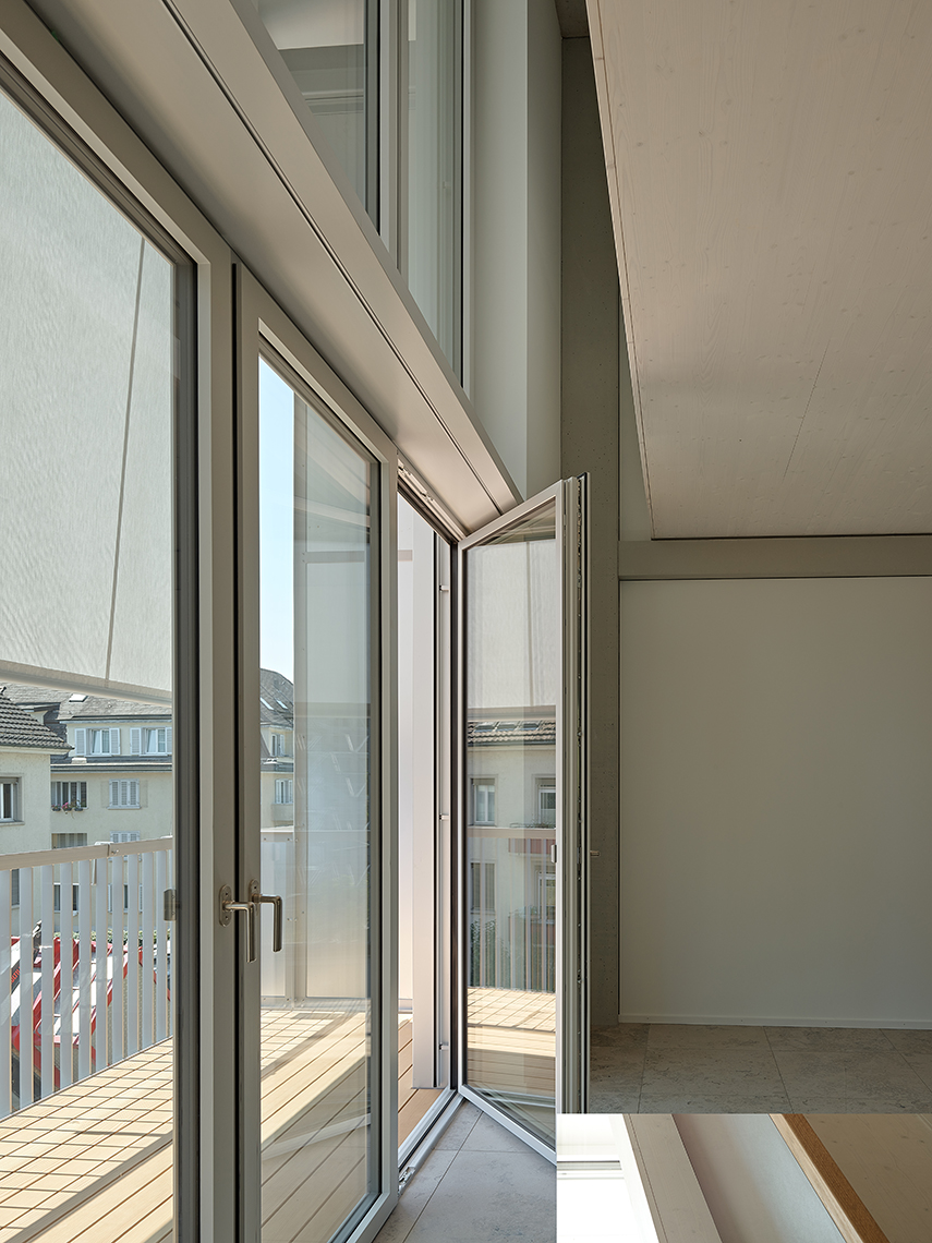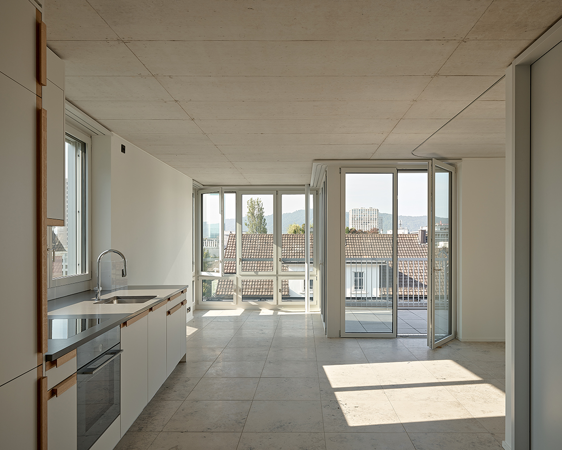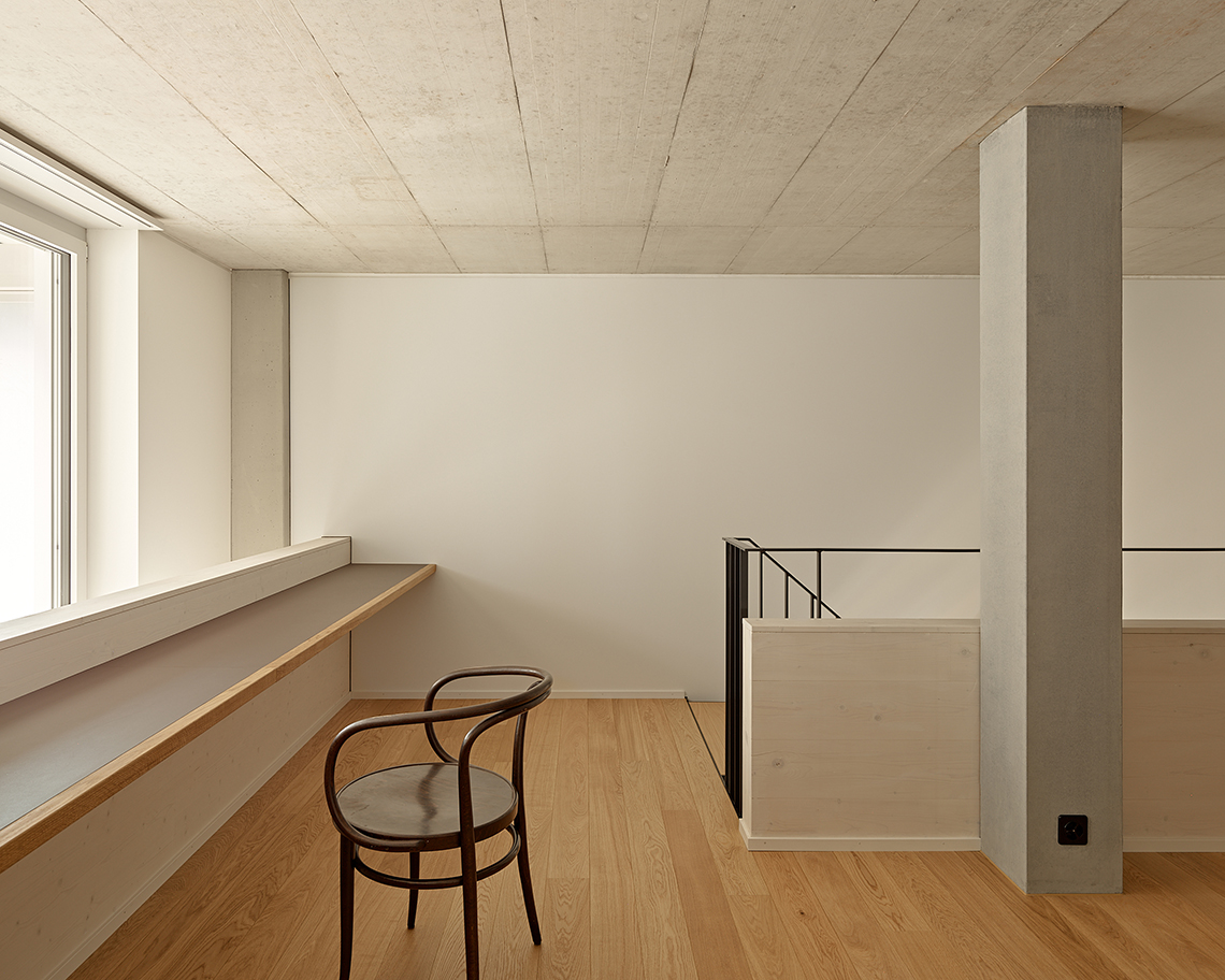 The core objective of the project is to ensure the greatest possible flexibility, which is why the apartment partition walls are made of masonry and the intermediate ceilings of the maisonette apartments are made of wood so that they can be dismantled. The remaining ceilings are made of in-situ concrete. Two-storey continuous columns in the centre of the apartments transfer the loads from the upper floors to the basement. In addition, a single-storey wooden column on the ground floor allows for a large recess in the CLT ceiling for the staircase to the upper living area.