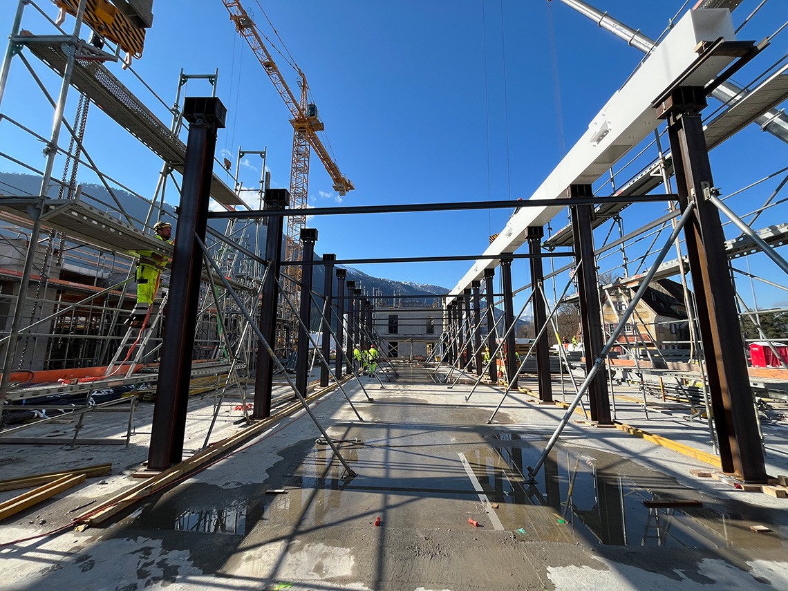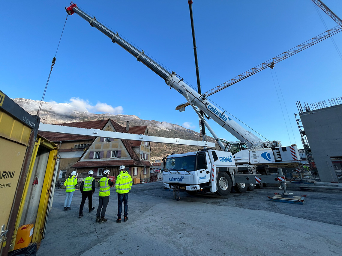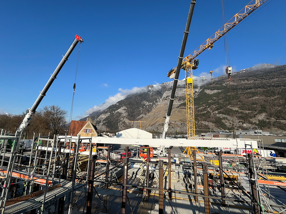 Bautechnisches Schlüsselereignis am Mittwoch auf der Baustelle Fachhochschulzentrum Graubünden in Chur: Das erfolgreiche Einheben der stählernen Untergurte bildete den Auftakt zur Errichtung der grossen Abfangwachwerke im Westflügel. Um die ausgedehnten stützenfreien Räume im Erdgeschoss zu ermöglichen, werden hier entlang der beiden Innenlängsachsen Fachwerk-Tragsysteme angeordnet, die über je 6 Regelfelder spannen und sich über drei Geschosse erstrecken, um die verfügbare statische Höhe maximal zu nutzen. Hieraus ergeben sich die bemerkenswerten Gesamtabmessungen von ca. 35m Länge und ca. 12.5 m Höhe. Vertikalen Pfosten und Obergurt aus hochfestem Buchen-Furnierschichtholz sowie Zugdiagonalen in Stahlbauweise vervollständigen die Fachwerkkonstruktion. Die Knotenbereiche beim Obergurt werden in Ortbeton ausgeführt.