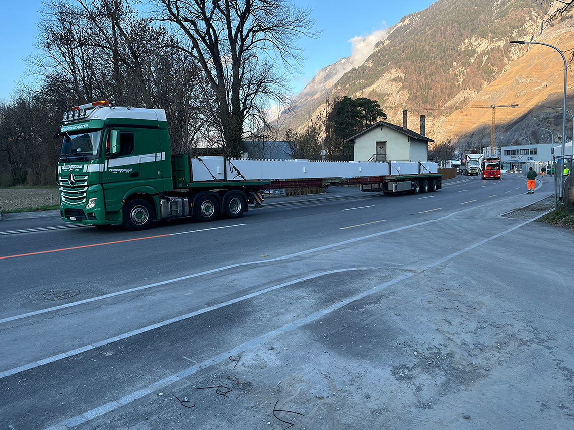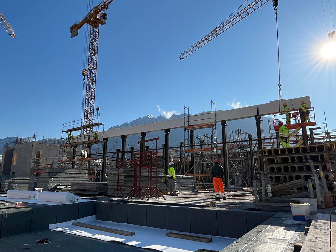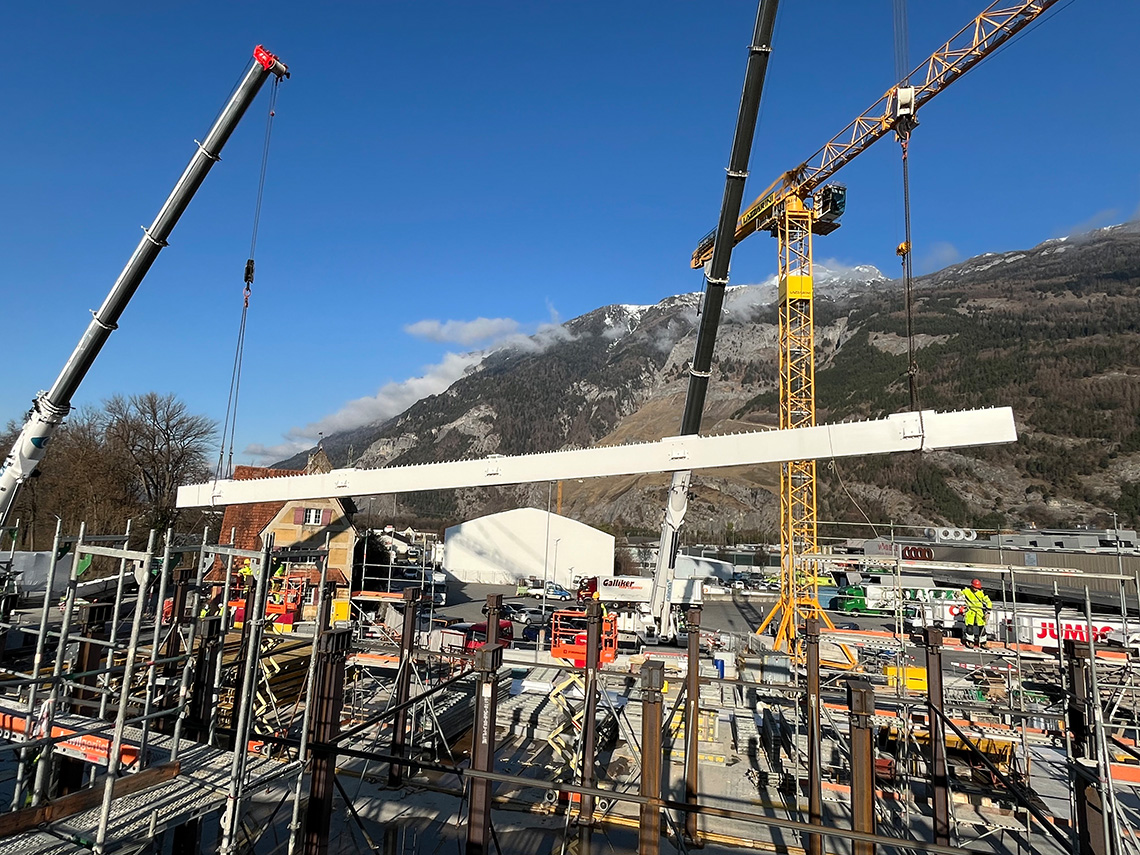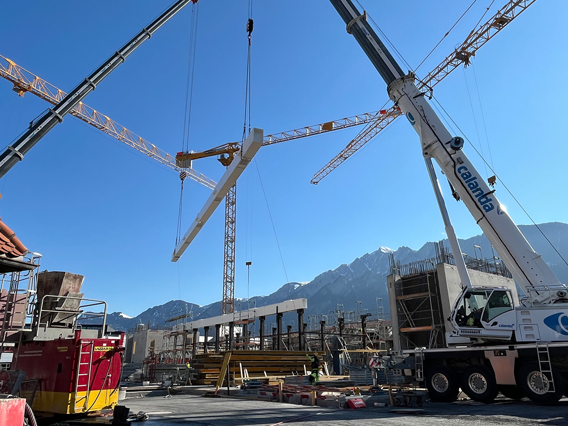 Bautechnisches Schlüsselereignis am Mittwoch auf der Baustelle Fachhochschulzentrum Graubünden in Chur: Das erfolgreiche Einheben der stählernen Untergurte bildete den Auftakt zur Errichtung der grossen Abfangwachwerke im Westflügel. Um die ausgedehnten stützenfreien Räume im Erdgeschoss zu ermöglichen, werden hier entlang der beiden Innenlängsachsen Fachwerk-Tragsysteme angeordnet, die über je 6 Regelfelder spannen und sich über drei Geschosse erstrecken, um die verfügbare statische Höhe maximal zu nutzen. Hieraus ergeben sich die bemerkenswerten Gesamtabmessungen von ca. 35m Länge und ca. 12.5 m Höhe. Vertikalen Pfosten und Obergurt aus hochfestem Buchen-Furnierschichtholz sowie Zugdiagonalen in Stahlbauweise vervollständigen die Fachwerkkonstruktion. Die Knotenbereiche beim Obergurt werden in Ortbeton ausgeführt.