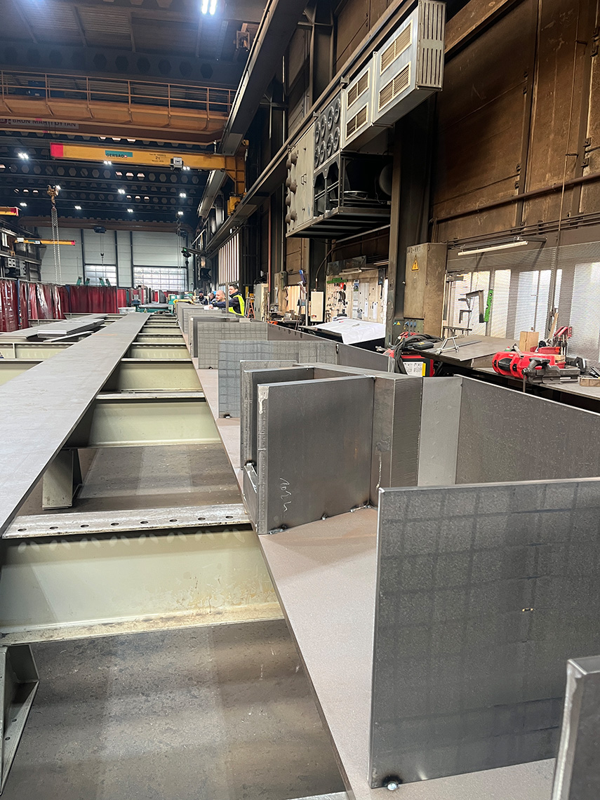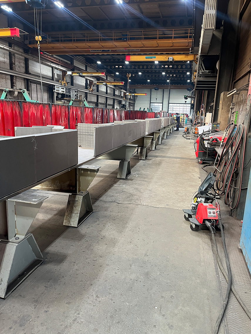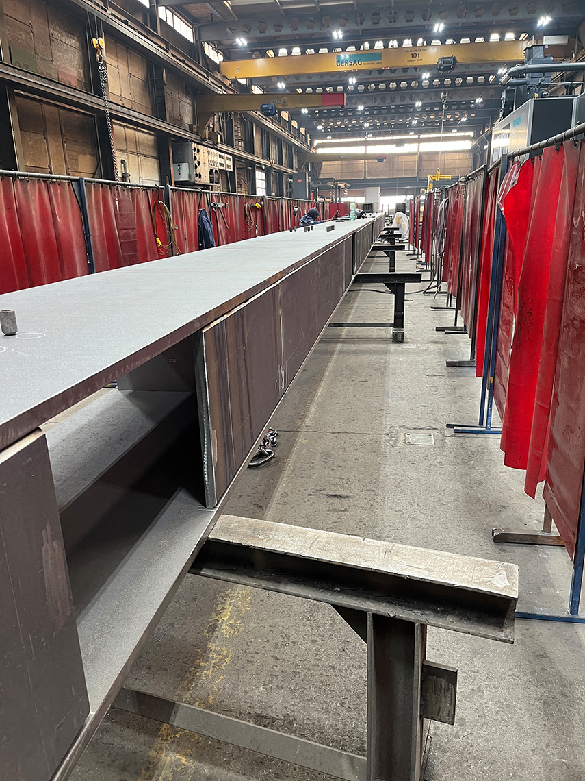 Die am Mittwoch versetzten Untergurte sind in Stahlbauweise mit Kastenquerschnitten 550×800 aus dickwandigen Blechen t=30mm gefertigt und erfüllen den erforderlichen Feuerwiderstand (R30) ohne Verkleidung. Die mittleren Segmente haben eine Länge von 27.5 m und ein Gewicht von 22t. An den Trägern sind bereits die Anschlüsse für die Elementträger (Peikko-Konsolen) und Ortbeton vorbereitet.