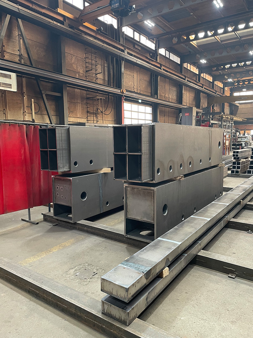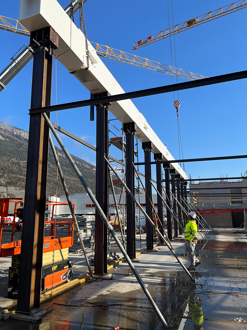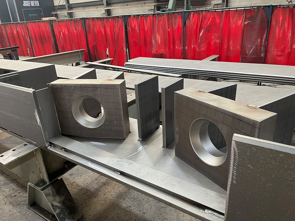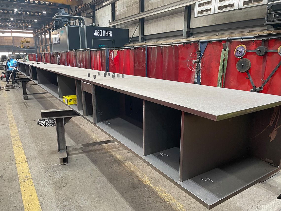 Die am Mittwoch versetzten Untergurte sind in Stahlbauweise mit Kastenquerschnitten 550×800 aus dickwandigen Blechen t=30mm gefertigt und erfüllen den erforderlichen Feuerwiderstand (R30) ohne Verkleidung. Die mittleren Segmente haben eine Länge von 27.5 m und ein Gewicht von 22t. An den Trägern sind bereits die Anschlüsse für die Elementträger (Peikko-Konsolen) und Ortbeton vorbereitet.