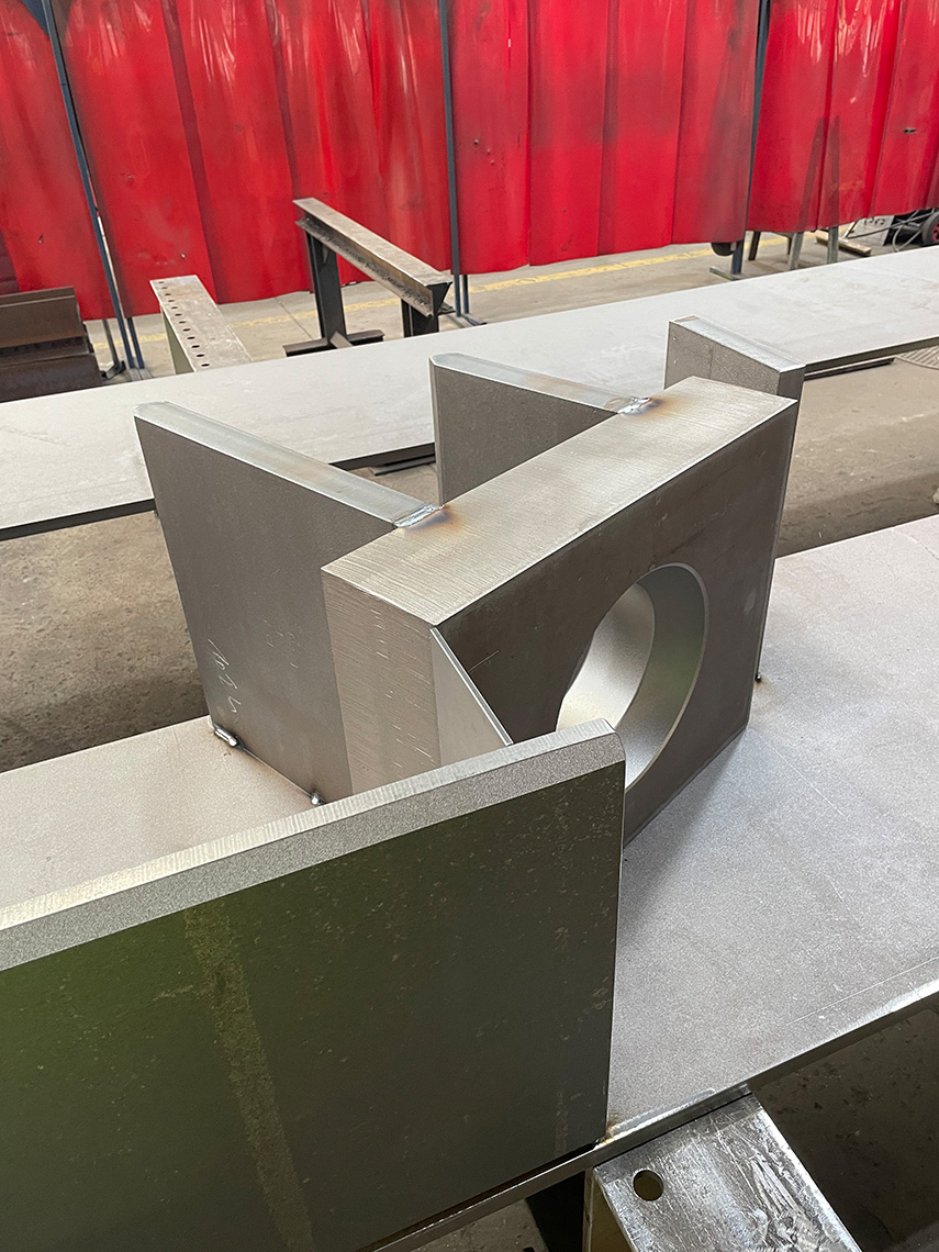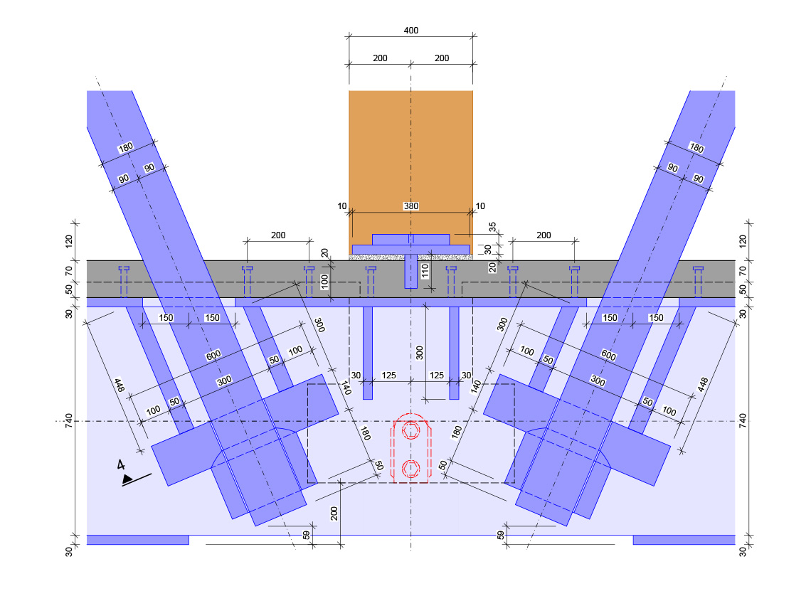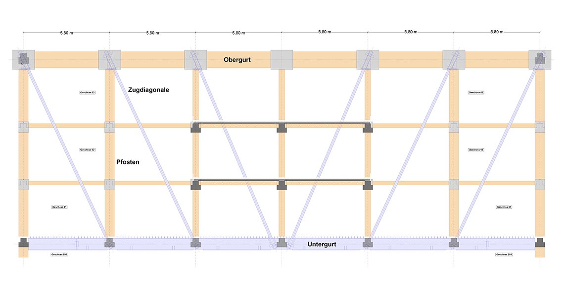 Die Plandarstellungen und die Fotoserie aus der Werkstatt verdeutlichen nicht nur die aussergewöhnlichen Dimensionen, sondern offenbaren auch das äusserlich nicht sichtbare «Innenleben» der Untergurte. Die Krafteinleitung der Zugdiagonalen (Æ180mm, Vollstahl) erfolgt direkt über massive Stahlquerschotte 600x600x140 (S690), die an den Knotenpunkten in das Stahlprofil der Untergurte integriert sind.
