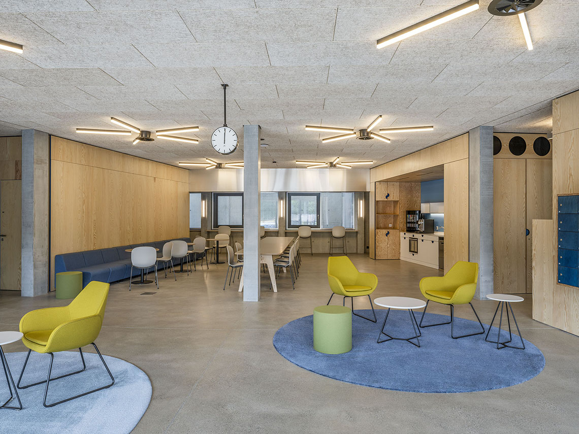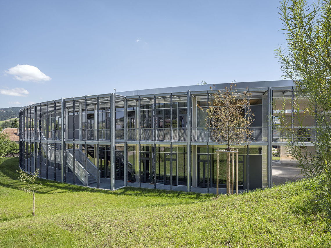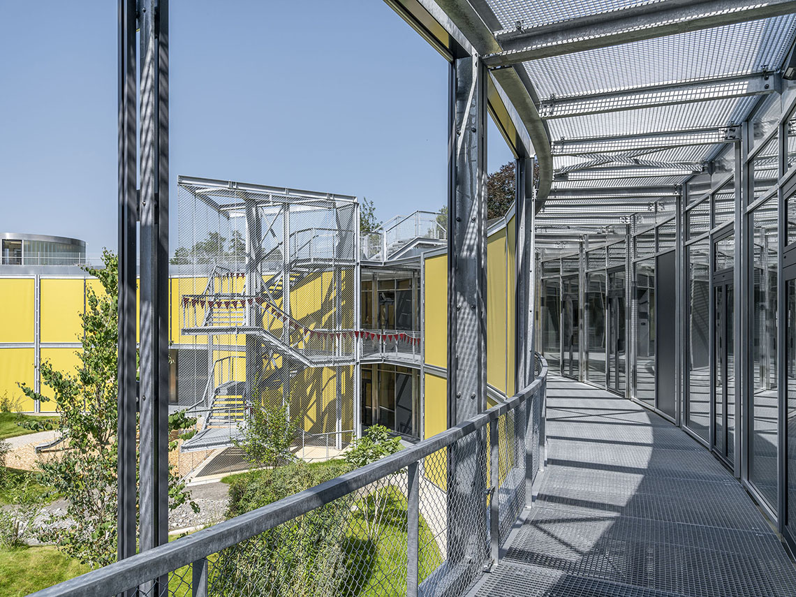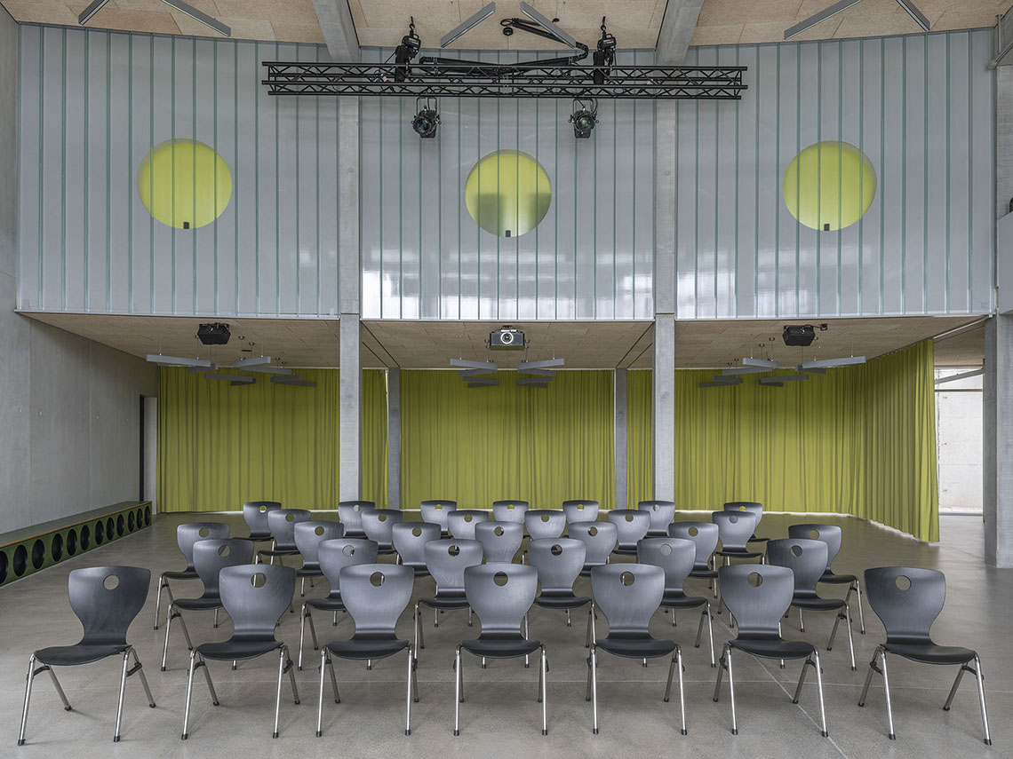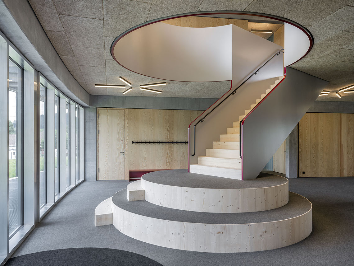 Le nouveau bâtiment annulaire Kaleidoskop vient compléter le complexe scolaire existant. L’édifice, articulé en quatre unités fonctionnelles, comprend des espaces d’enseignement et de travail en groupe pour 24 classes, des salles de musique, une aula polyvalente ainsi que des locaux destinés à l’accueil parascolaire. Implanté sur un terrain en pente, le bâtiment s’élève sur deux à trois niveaux, selon la topographie.