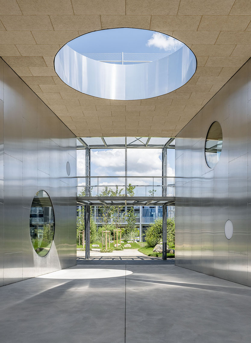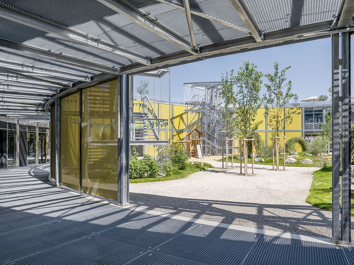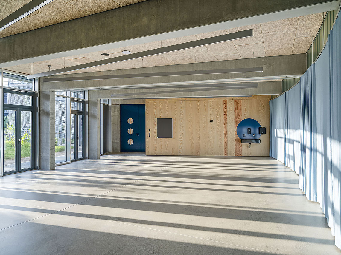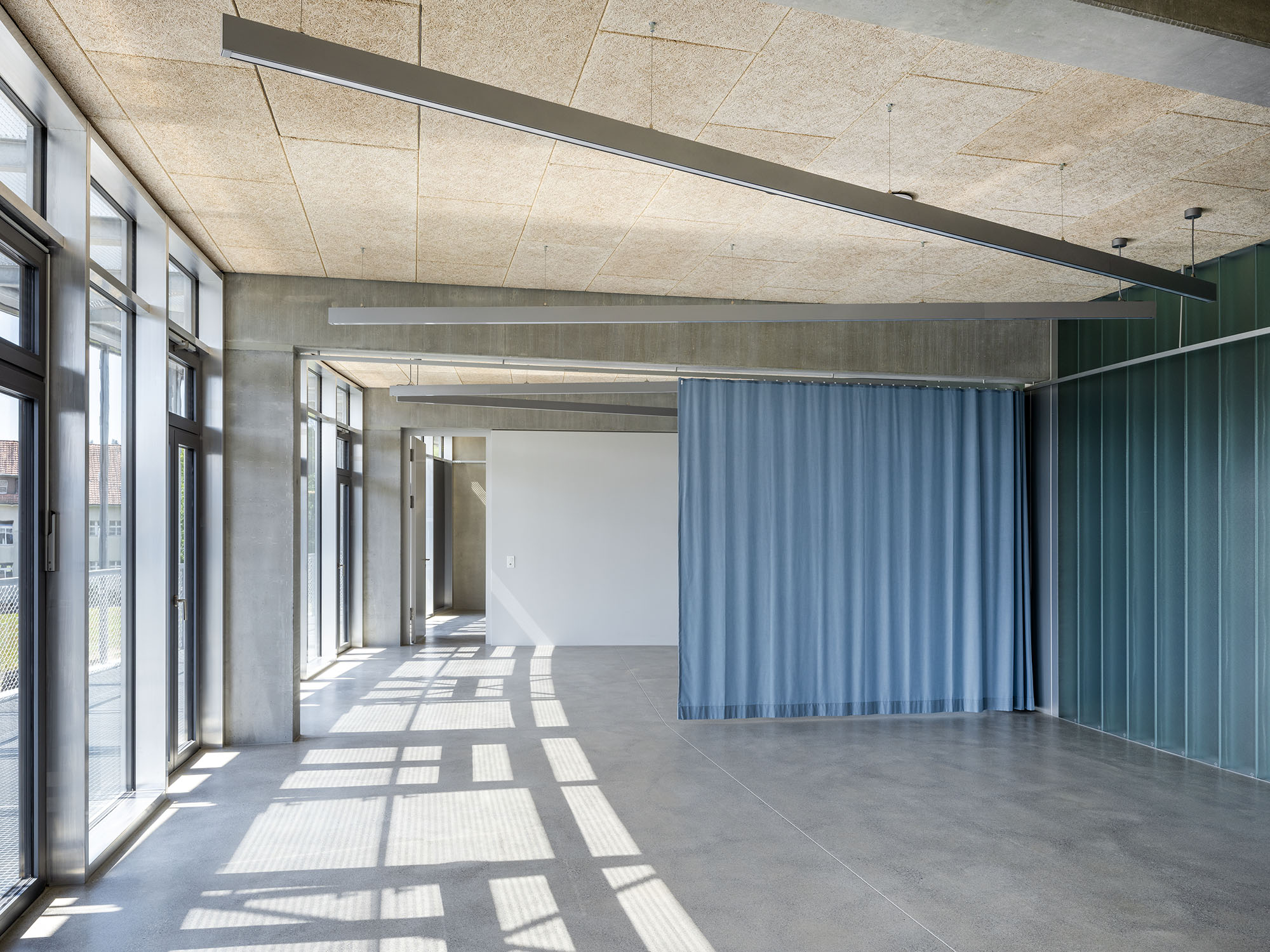 Le nouveau bâtiment annulaire Kaleidoskop vient compléter le complexe scolaire existant. L’édifice, articulé en quatre unités fonctionnelles, comprend des espaces d’enseignement et de travail en groupe pour 24 classes, des salles de musique, une aula polyvalente ainsi que des locaux destinés à l’accueil parascolaire. Implanté sur un terrain en pente, le bâtiment s’élève sur deux à trois niveaux, selon la topographie.