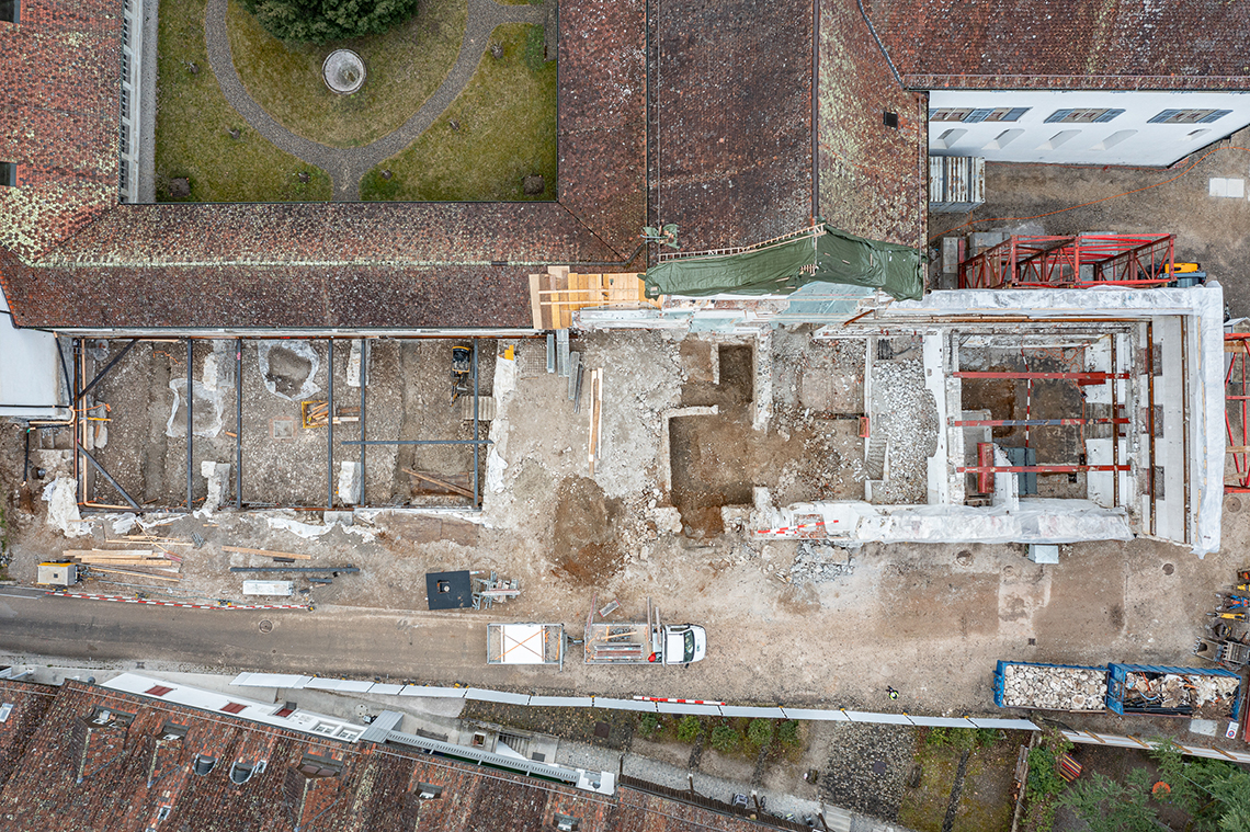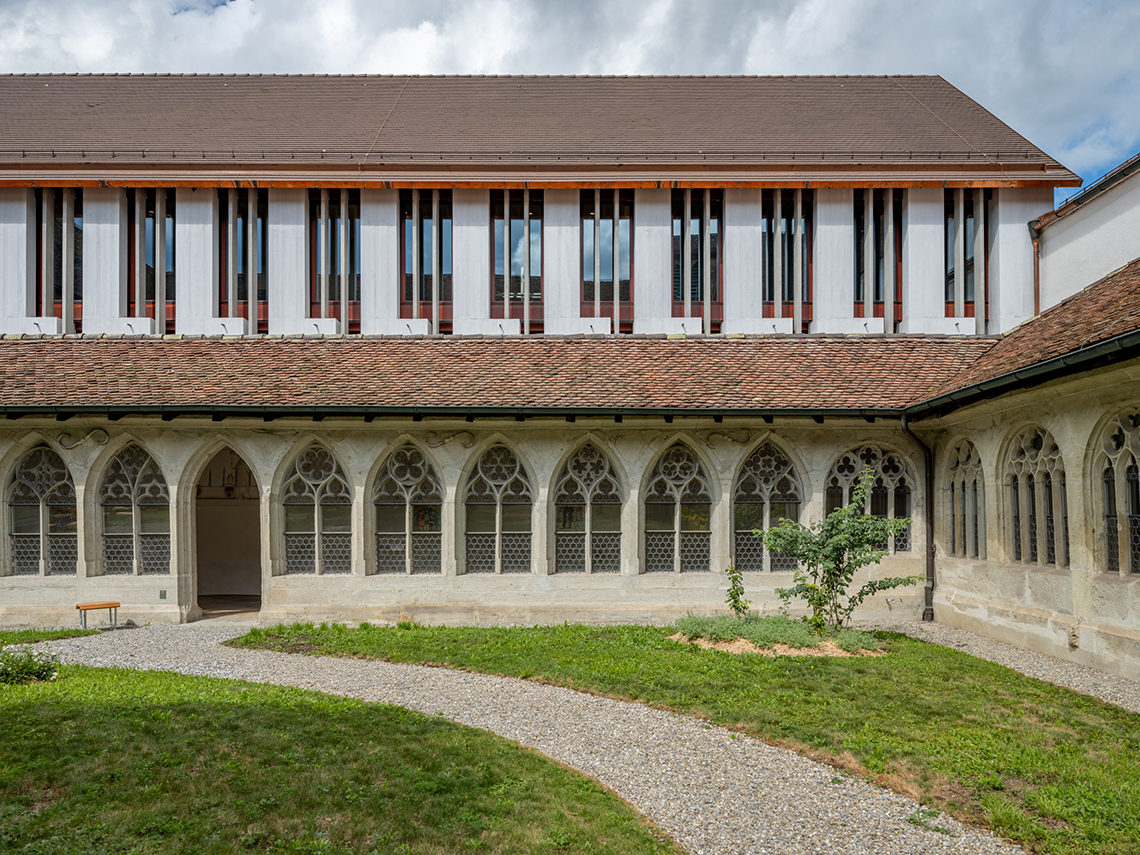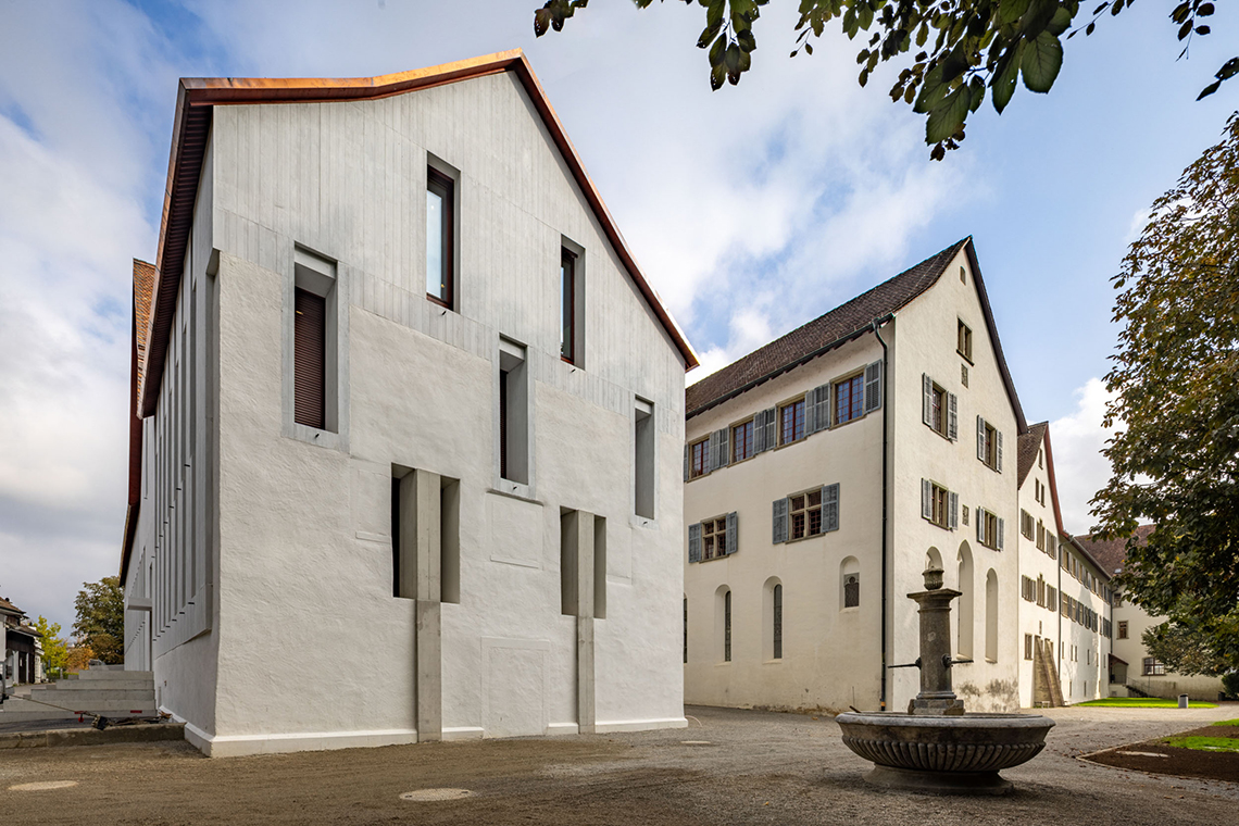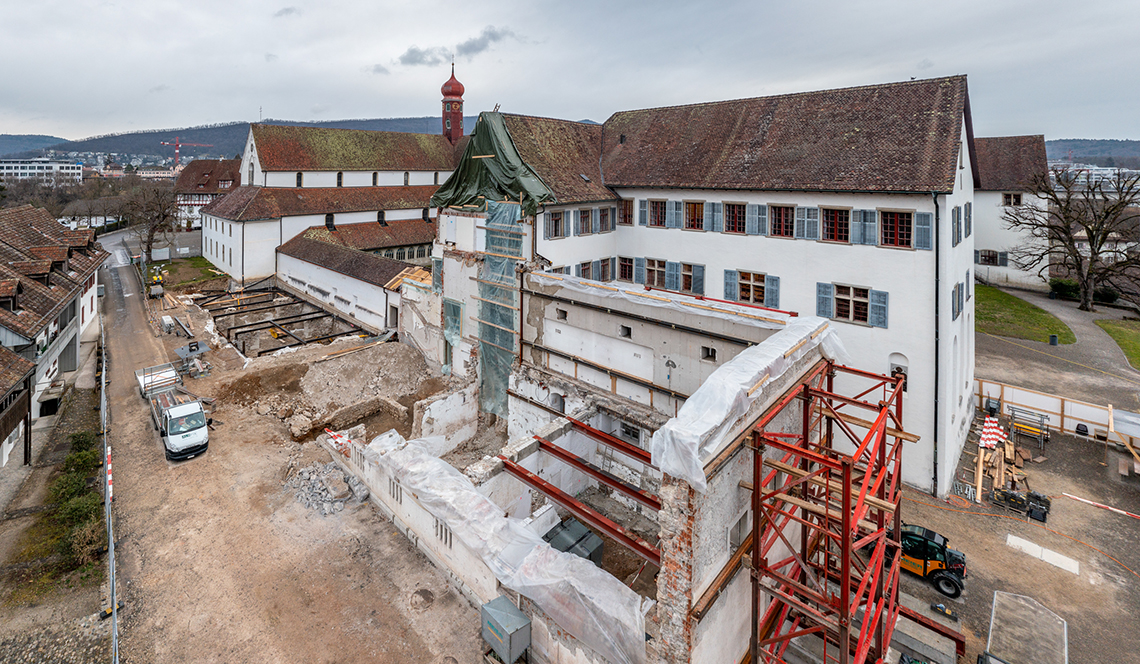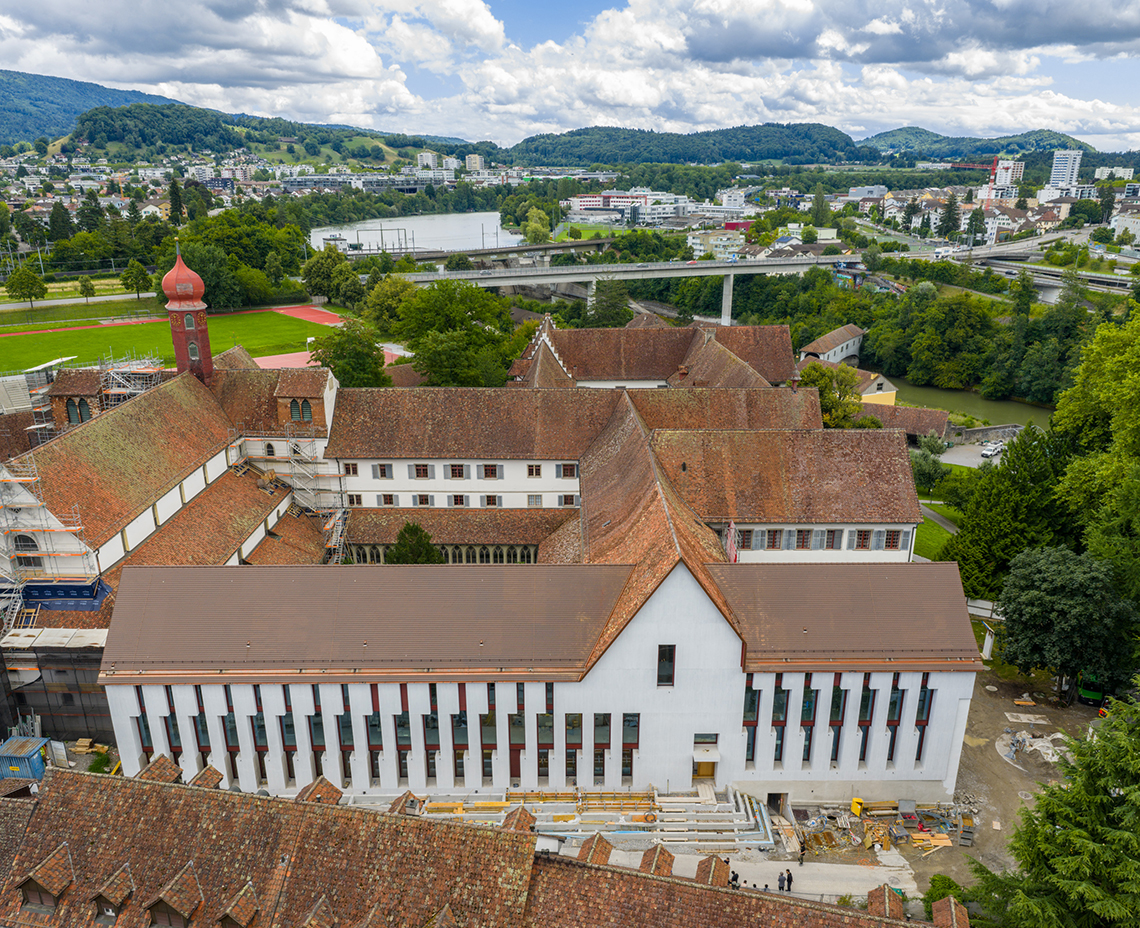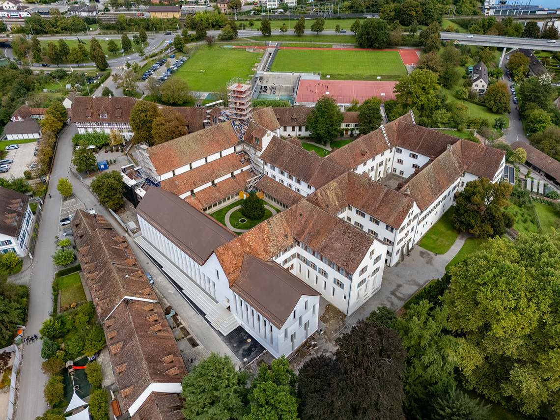 L’agrandissement de l’aile ouest de l’école cantonale de Wettingen permet de relier directement de nouvelles salles de classe au bâtiment principal sur le plan opérationnel. En outre, le projet apporte un complément important à l’ensemble historique du couvent. Le nouveau bâtiment offre de la place pour onze salles de classe, une salle d’étude au sous-sol et une galerie dans les combles. Le corps de bâtiment faisant l’objet du projet doit s’inspirer de la maison de Höngger, démolie en 1883, en termes de situation, de périmètre et de section. Les murs de fondation historiques existants sont classés monuments historiques et seront conservés.