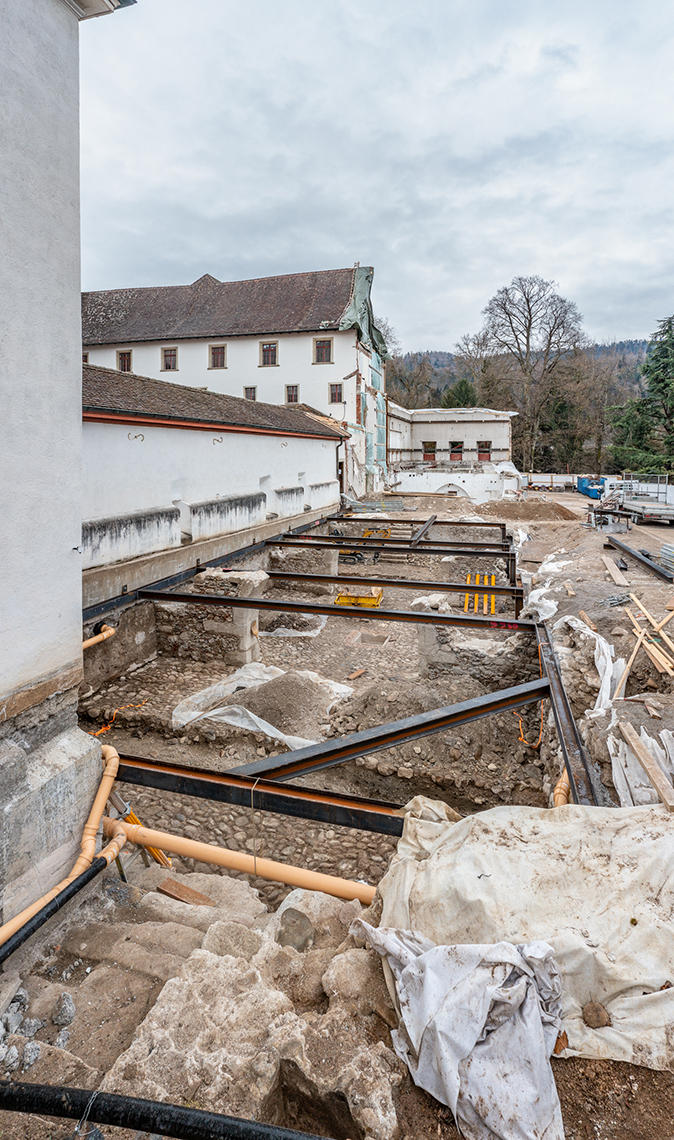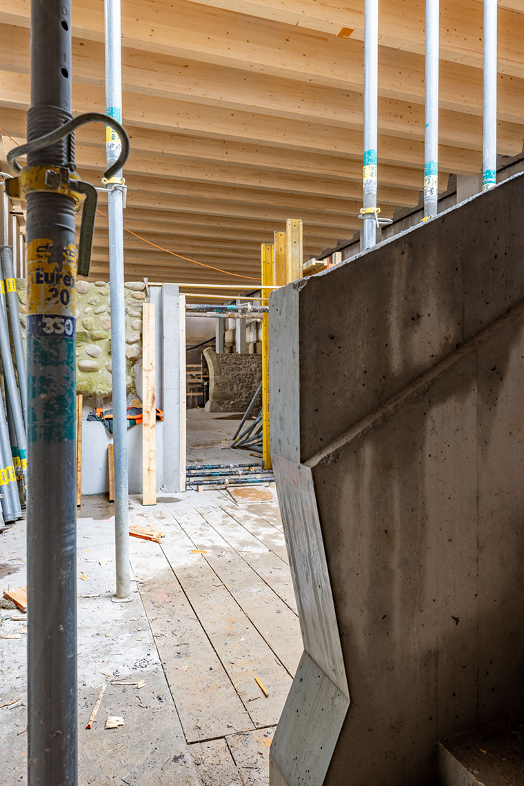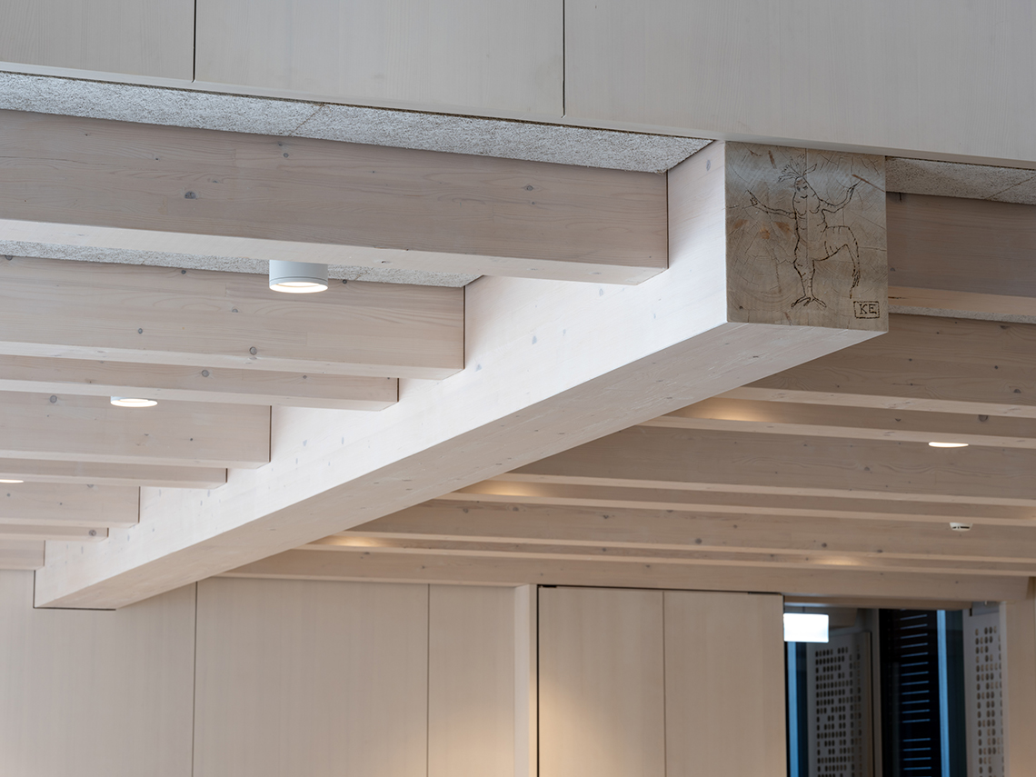 La nouvelle aile ouest comporte un sous-sol et trois étages. Les murs et les plafonds des zones d’accès (escaliers, ascenseurs) sont prévus en béton coulé sur place. Le plafond du sous-sol sera également coulé sur place. Tous les autres plafonds seront des plafonds mixtes bois-béton. Dans la zone de la salle d’étude au sous-sol, aucun pilier n’est souhaité à l’intérieur de la pièce. C’est pourquoi le plafond situé au-dessus du rez-de-chaussée est conçu comme une simple poutre d’une portée d’environ 11 mètres. Afin de maximiser la hauteur de la pièce au 2ème étage, un appui intermédiaire supplémentaire est introduit au niveau du plafond sous la forme d’une poutre Gerber en Baubuche. Les forces d’appui de la poutre Gerber sont suspendues à la charpente et transmises à la façade via les fermes de toit. Dans certaines zones, le radier et les fondations sont reconstruits de manière à ce que les charges puissent être transmises au sol de fondation.