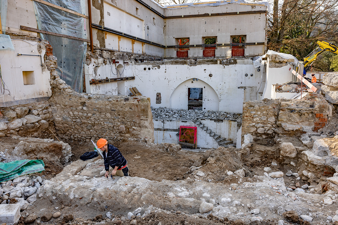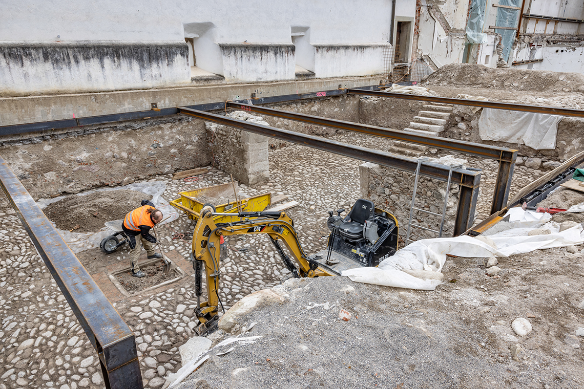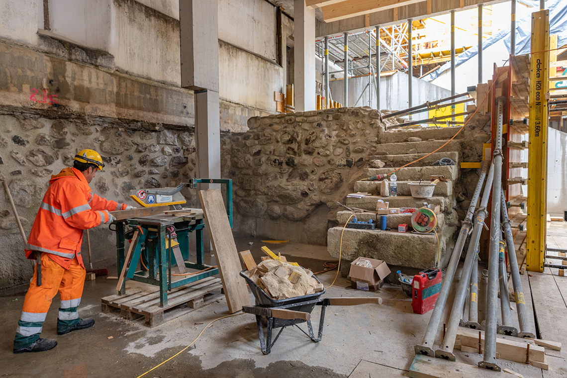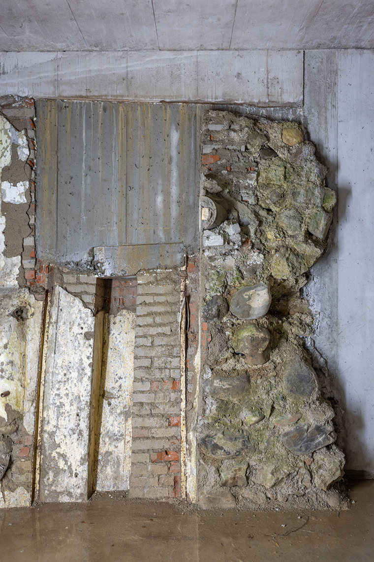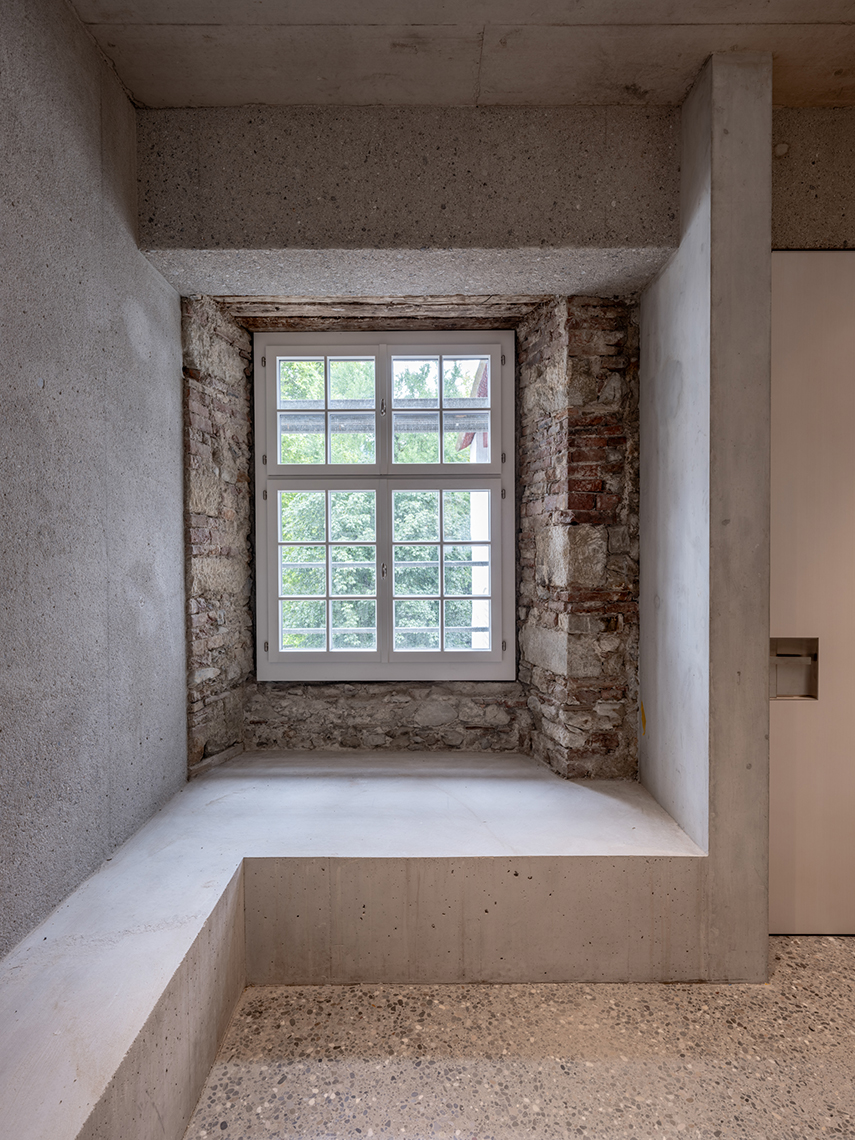 La façade porteuse en béton apparent repose sur les murs en maçonnerie classés monuments historiques. Au moyen d’une poutre de répartition, les forces sont transmises de manière uniforme à l’existant. La section de la façade en béton apparent se rétrécit en hauteur. Les charges de plafond sont notamment supportées par la façade. Le renforcement du bâtiment est assuré par le nouveau noyau en béton armé ainsi que par les façades en béton apparent.