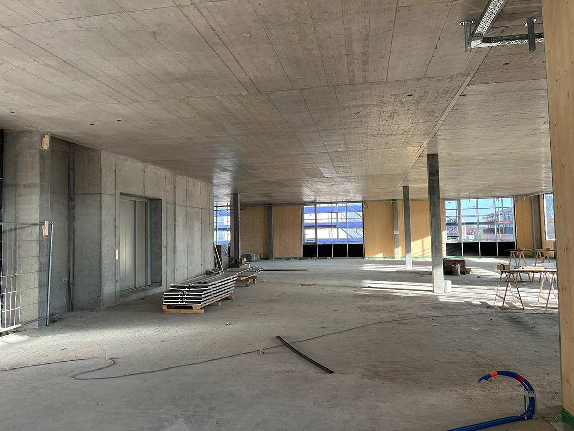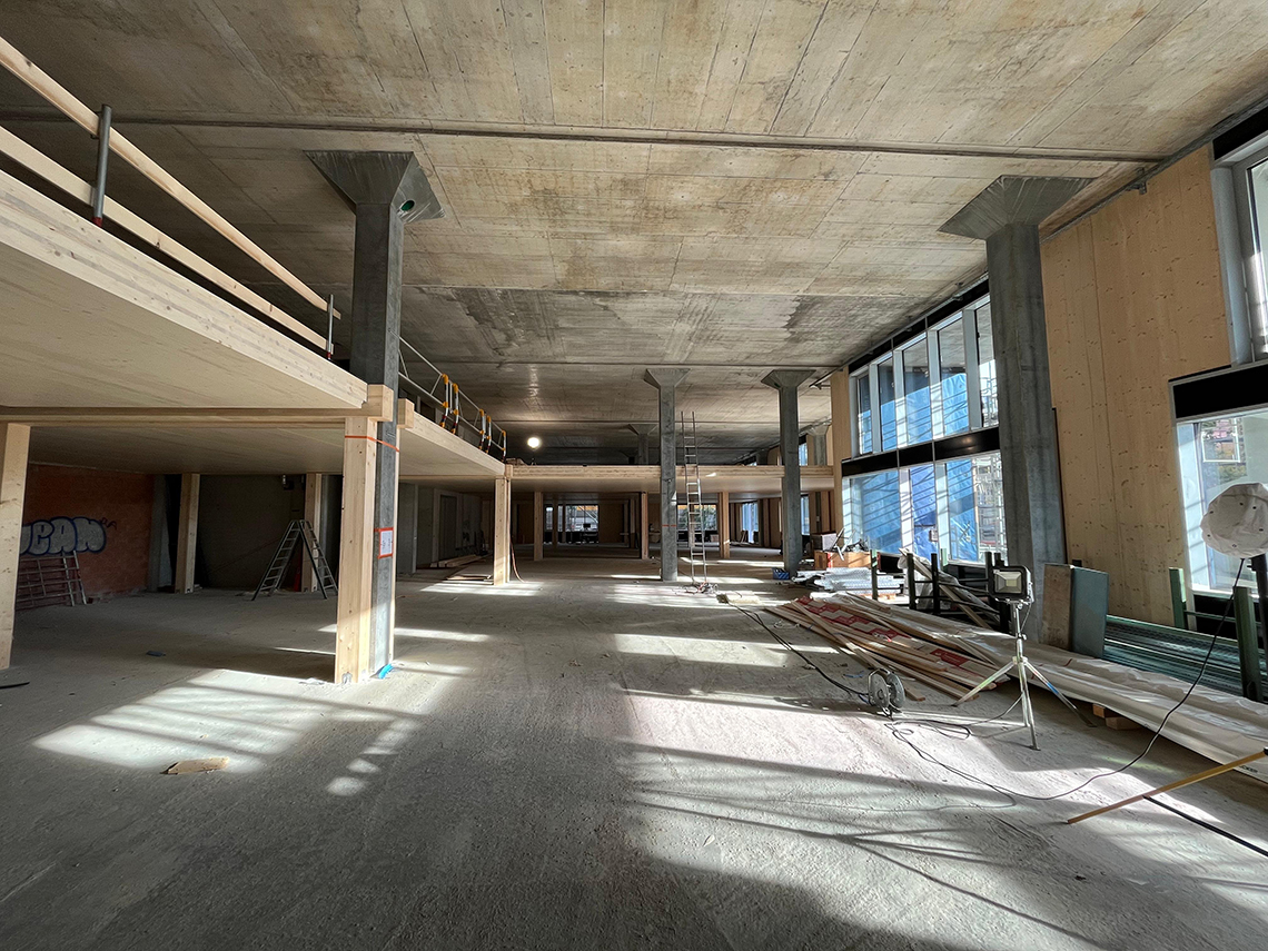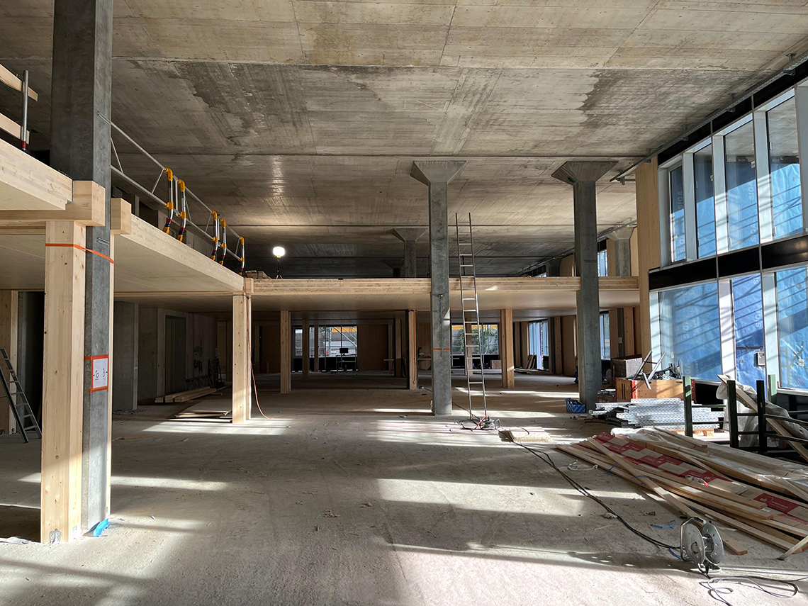 Das fertiggestellte Tragwerk vermittelt bereits eindrücklich die rohe Optik, die das Gewerbehaus weiterhin prägen wird. Das anwesende Tragwerksteam von LÜCHINGER MEYER PARTNER nutzte die Gelegenheit zu einem ausgedehnten Rundgang durch den Skelettbau mit seinen lichten Räumen, den Pilzstützen, den auskragenden Unterzügen im Anlieferungsbereich, den hölzernen Galerien … Seit dem Wettbewerbserfolg mit Käferstein & Meister Architekten und Ekinci Architekten durften wir das ambitionierte Projekt begleiten.