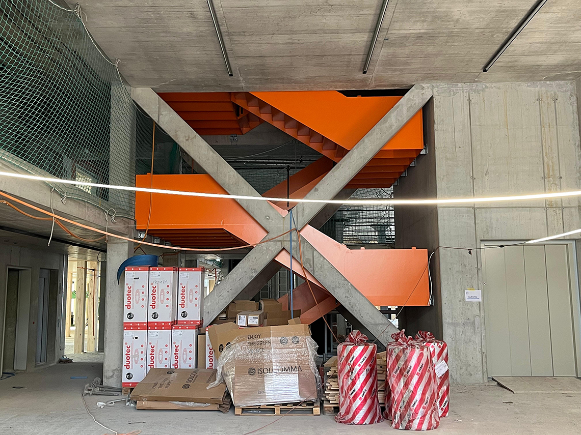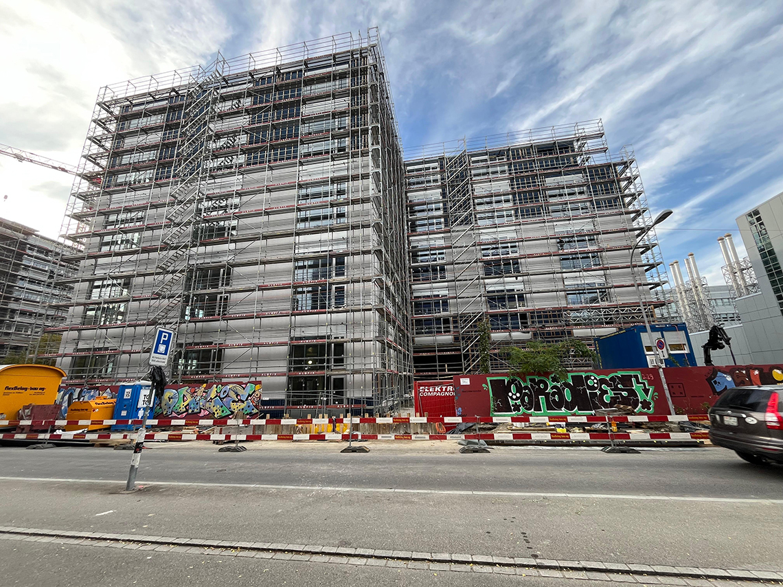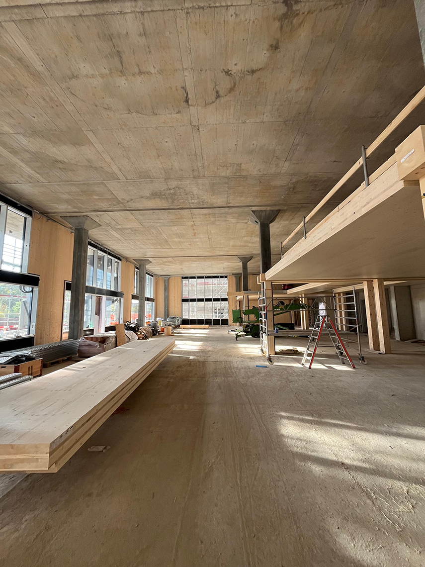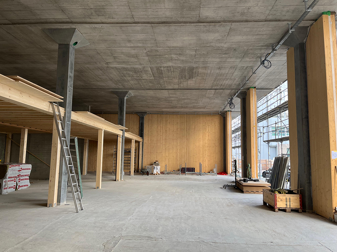 Das fertiggestellte Tragwerk vermittelt bereits eindrücklich die rohe Optik, die das Gewerbehaus weiterhin prägen wird. Das anwesende Tragwerksteam von LÜCHINGER MEYER PARTNER nutzte die Gelegenheit zu einem ausgedehnten Rundgang durch den Skelettbau mit seinen lichten Räumen, den Pilzstützen, den auskragenden Unterzügen im Anlieferungsbereich, den hölzernen Galerien … Seit dem Wettbewerbserfolg mit Käferstein & Meister Architekten und Ekinci Architekten durften wir das ambitionierte Projekt begleiten.