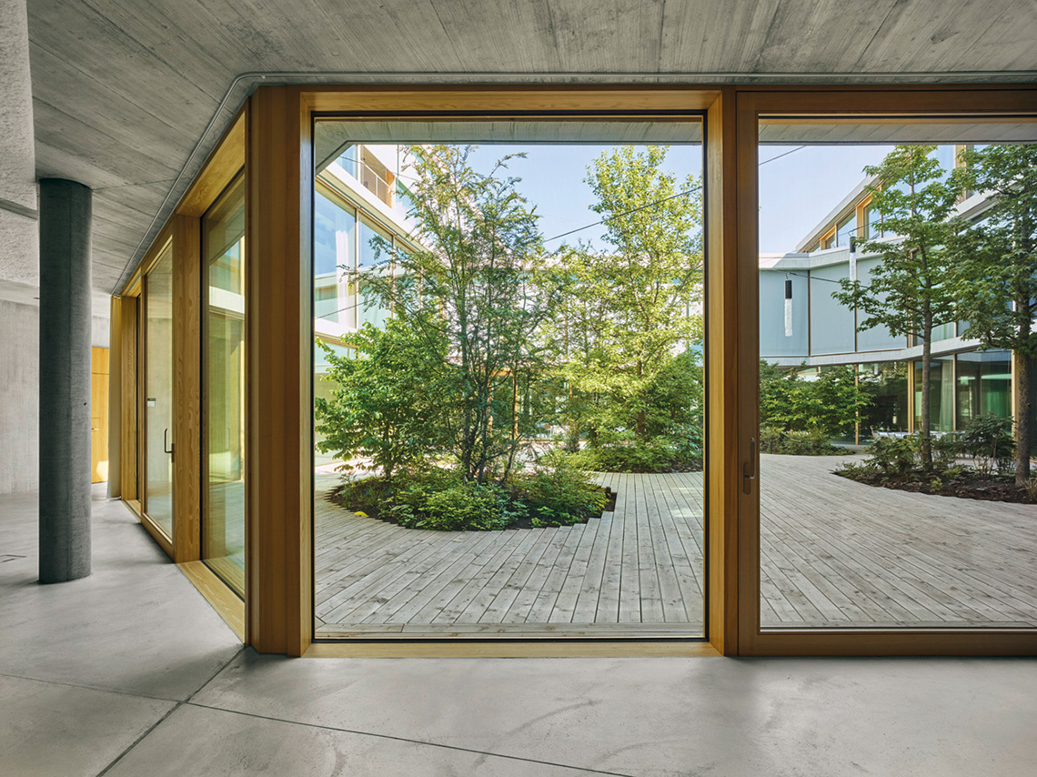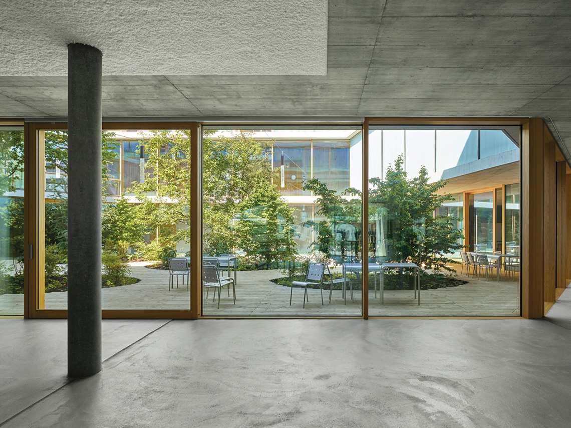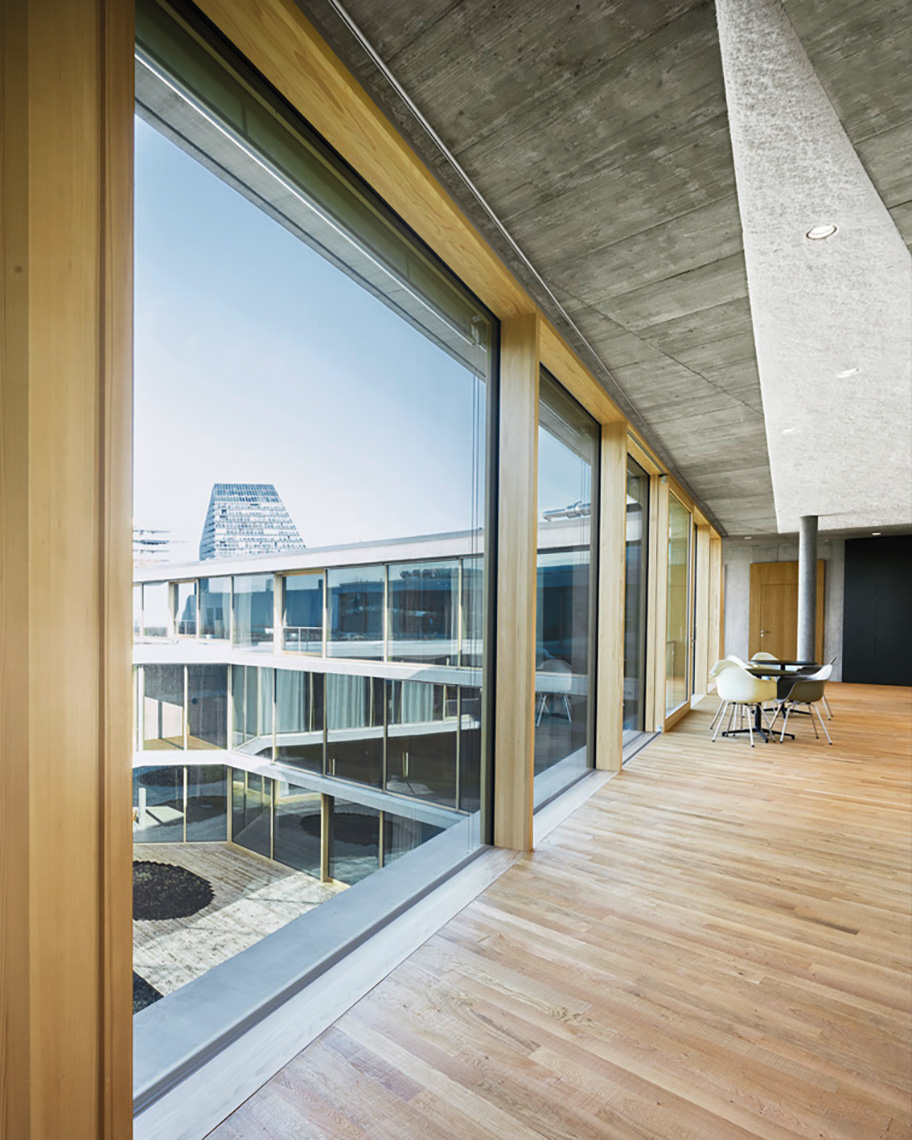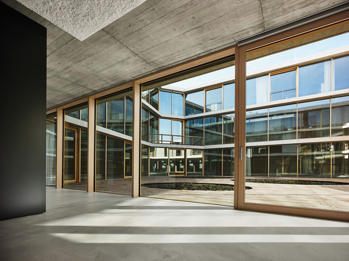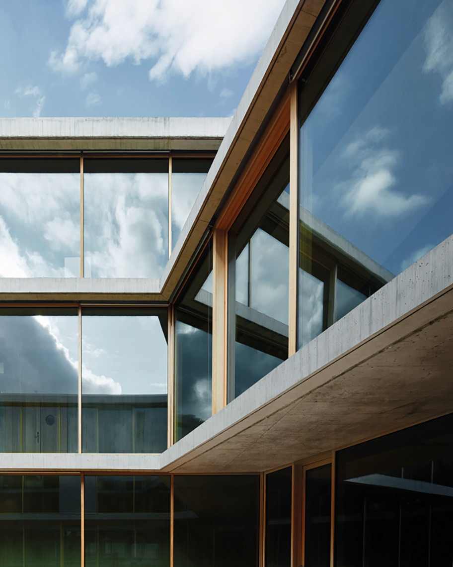 Die Fassadenplanung fokussierte auf die bewusste Reduktion der sichtbaren Materialen auf Glas und Beton. In den Aussenfassaden wurden grossformatige Dreh-Fenster in Aluminium thermisch getrennt ausgeführt. Die Fenstermontage erfolgte zwischen äusserer und innerer Betonschale, die Planung zielte auf minimale Rahmenansichten ab. Die Innenhoffassade zeigt sich als raumhohe Verglasung. Hier kamen Pfosten-Riegelkonstruktionen in Holz und grossformartige Hebeschiebefenster zum Einsatz.