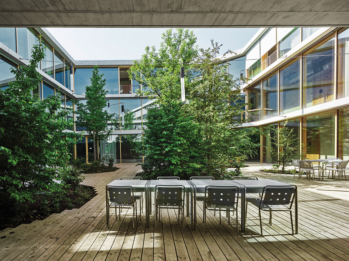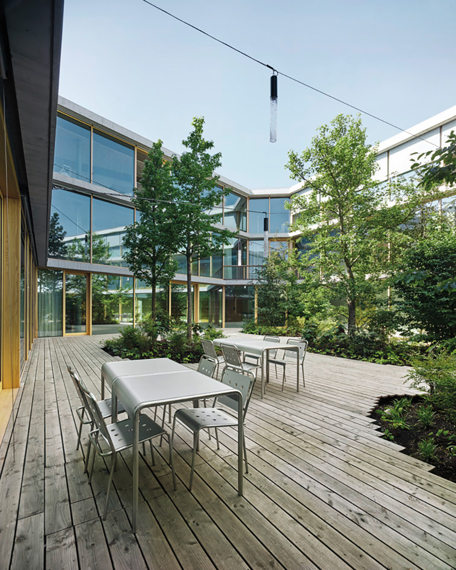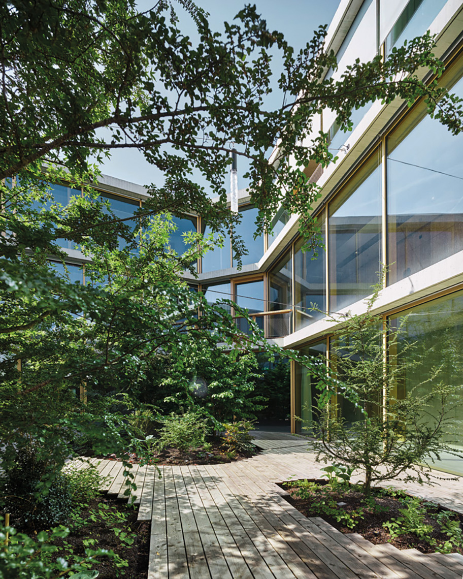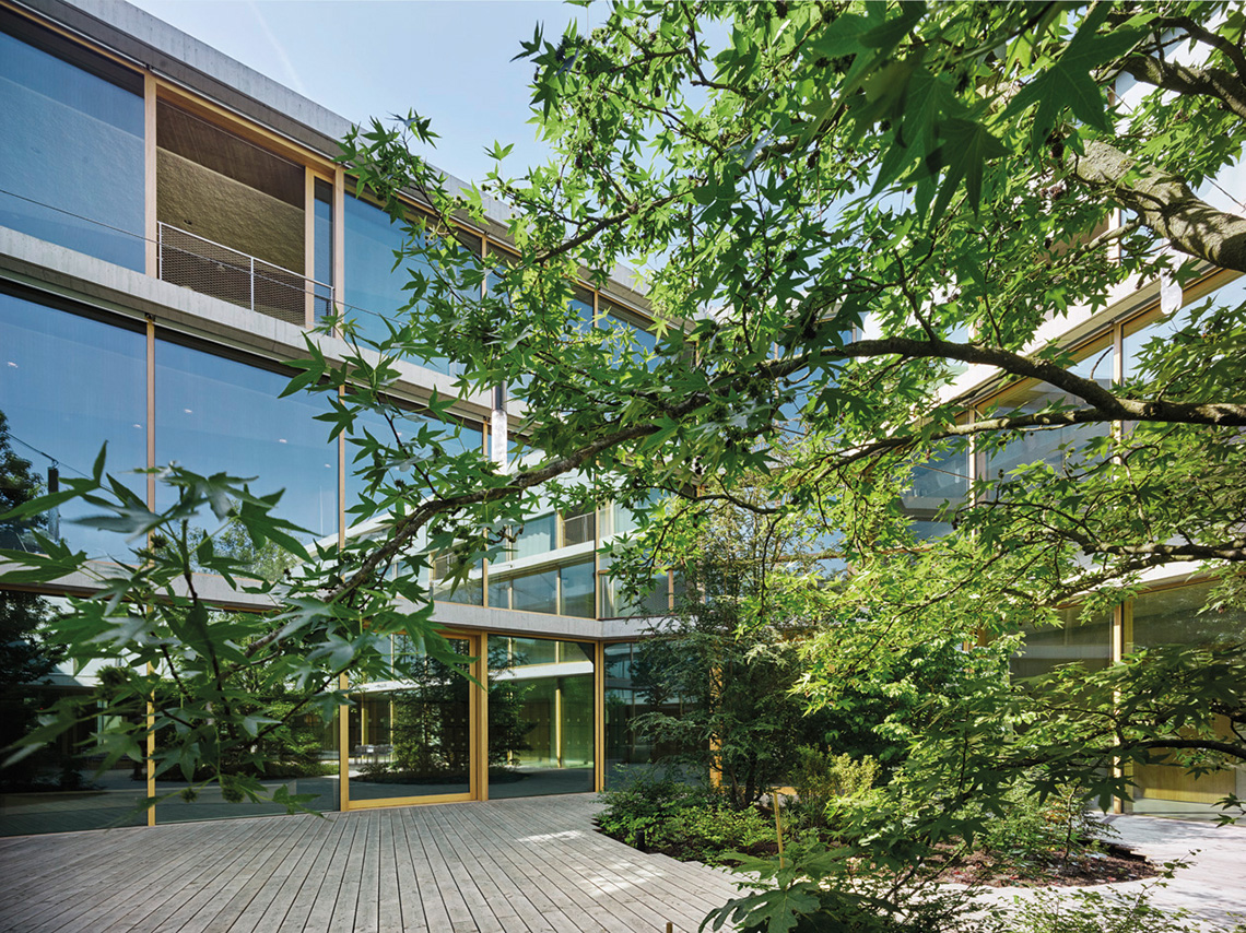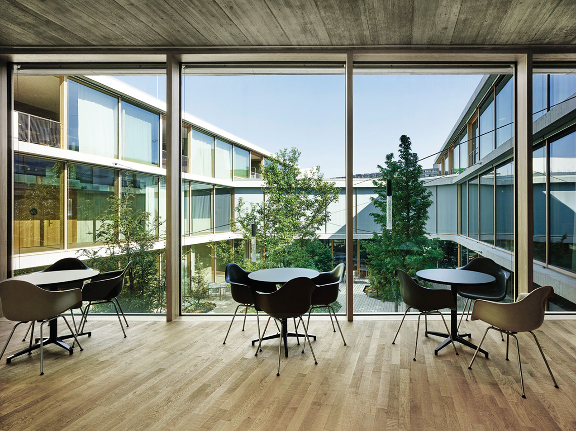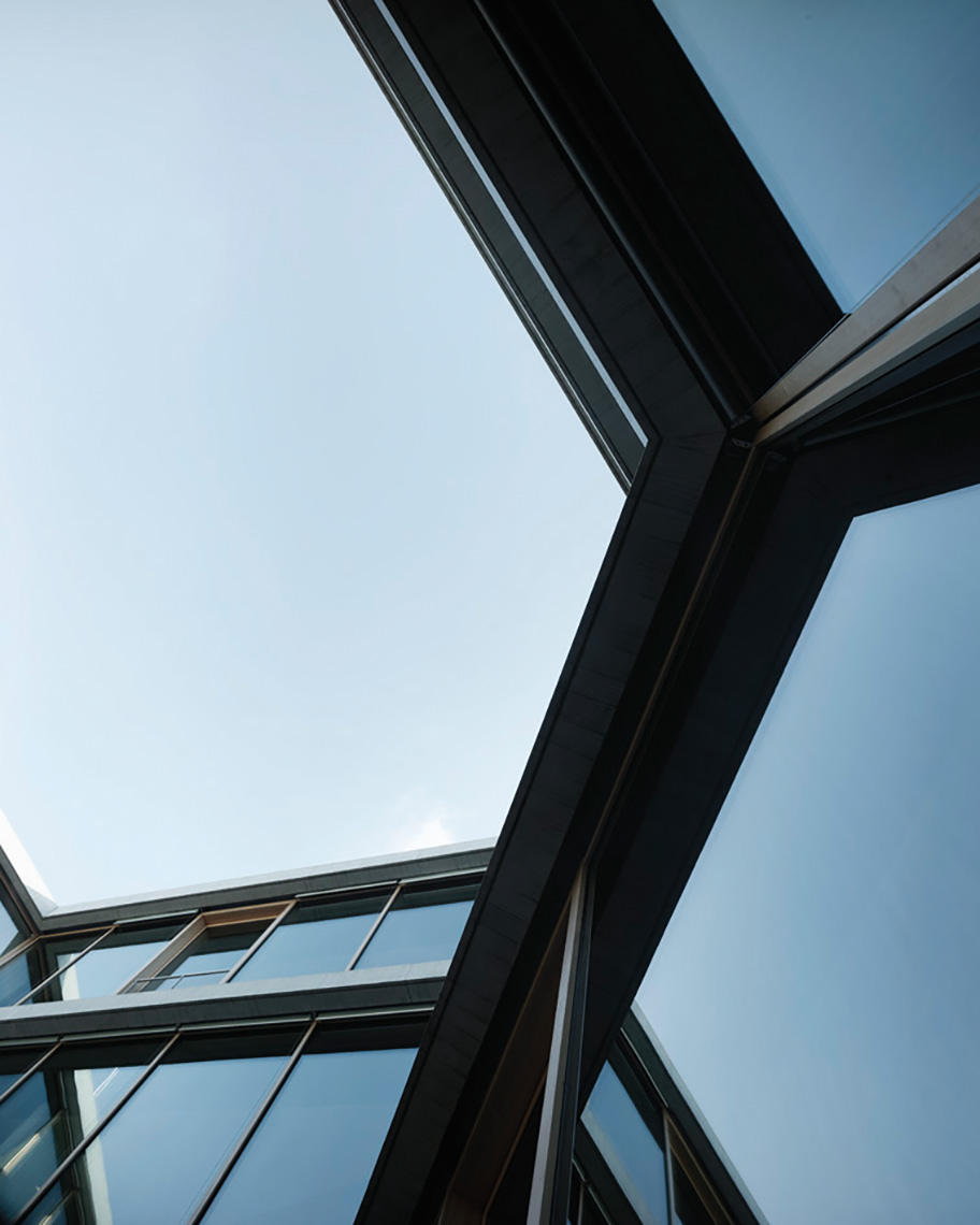 Die Fassadenplanung fokussierte auf die bewusste Reduktion der sichtbaren Materialen auf Glas und Beton. In den Aussenfassaden wurden grossformatige Dreh-Fenster in Aluminium thermisch getrennt ausgeführt. Die Fenstermontage erfolgte zwischen äusserer und innerer Betonschale, die Planung zielte auf minimale Rahmenansichten ab. Die Innenhoffassade zeigt sich als raumhohe Verglasung. Hier kamen Pfosten-Riegelkonstruktionen in Holz und grossformartige Hebeschiebefenster zum Einsatz.