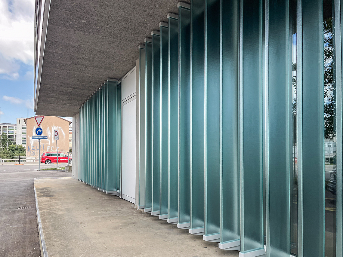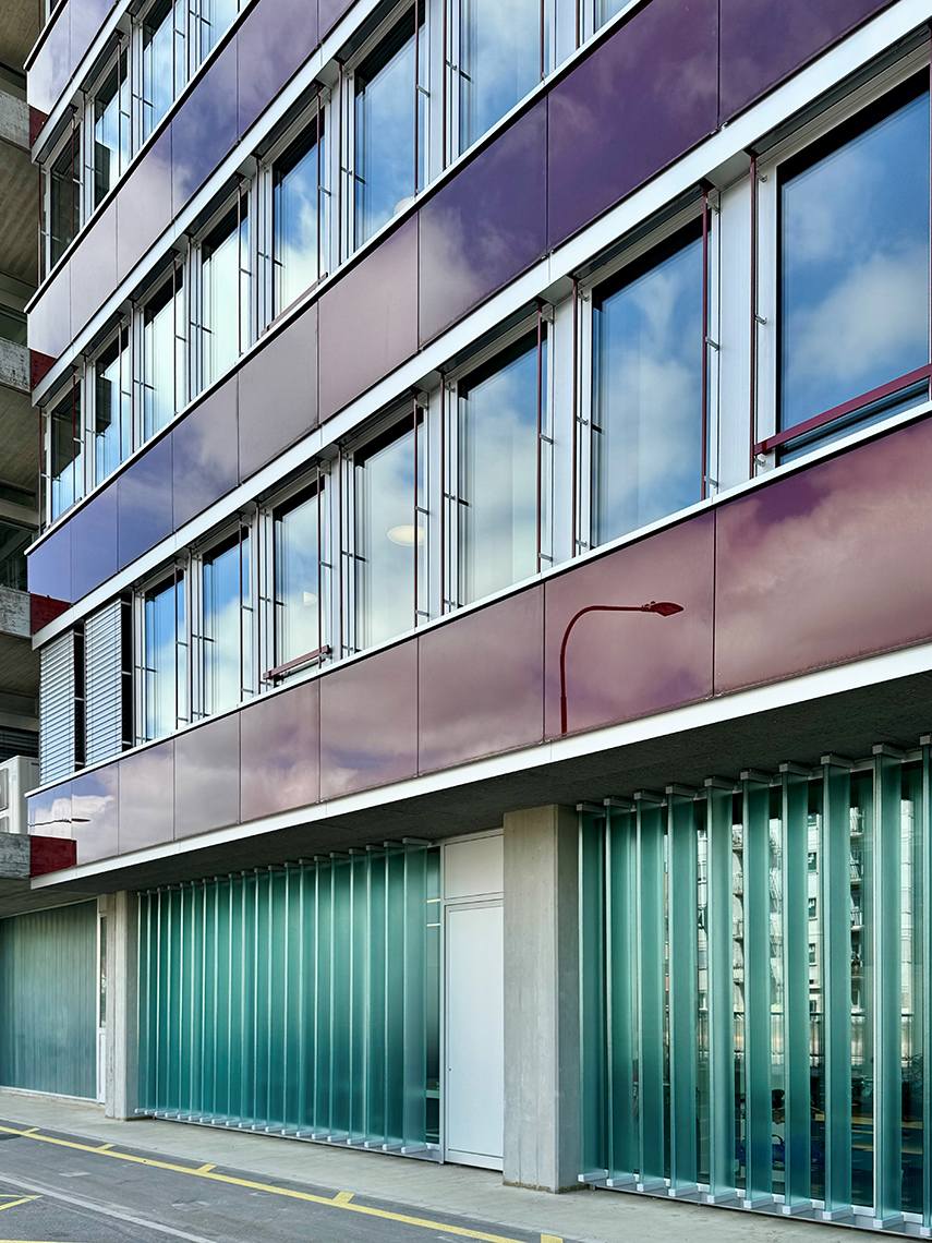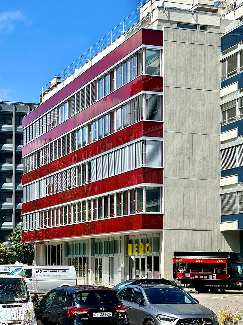 Mit der Fassadensanierung an der Herostrasse 5 in Zürich wurde das Ziel verfolgt, ein 50-jähriges Schulgebäude energetisch, ökologisch und gestalterisch zu erneuern und gleichzeitig die bestehende Substanz maximal zu erhalten. Das Resultat ist eine technisch optimierte, ressourcenschonende Gebäudehülle, die dank innovativer Re-Use und Re-Manufacturing-Methoden einen grossen Teil der ursprünglichen Materialien weiterverwendet. Im Prozess wurden bestehende, 50 Jahre alte Brüstungsgläser technisch bewertet, aufbereitet und mittels laminarer Silikonverklebung mit einer neuen Tragstruktur verbunden. Die Erdgeschossfassade wurde in einer ähnlichen Tiefe ertüchtigt. Direkt wiederverwertet wurden die Profilitgläser. Diese wurden zu rechteckförmigen Lamellen gefügt, teilweise zur passiven Verschattung eingesetzt oder zu Leuchtkörpern umgebaut. Der prägende Skelettbau mit seiner rot emaillierten Glasbrüstungsbekleidung bleibt in Charakter und Proportionen erhalten. Moderne Aluminiumfenster, verbesserte Dämmung und Lüftungsklappen mit schallabsorbierenden Elementen entsprechen heutigen Komfort- und Energieanforderungen. Ausgelöst wurde der Umbau durch den Sanierungsbedarf der seit 1972 unangetasteten Fassade und den Anspruch, ein zukunftsweisendes Beispiel nachhaltigen Bauens zu realisieren.